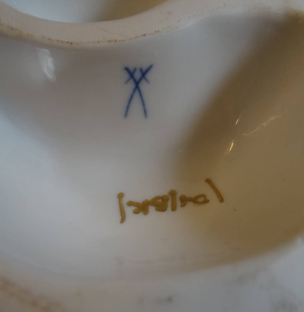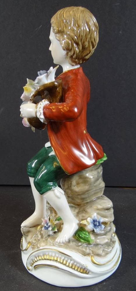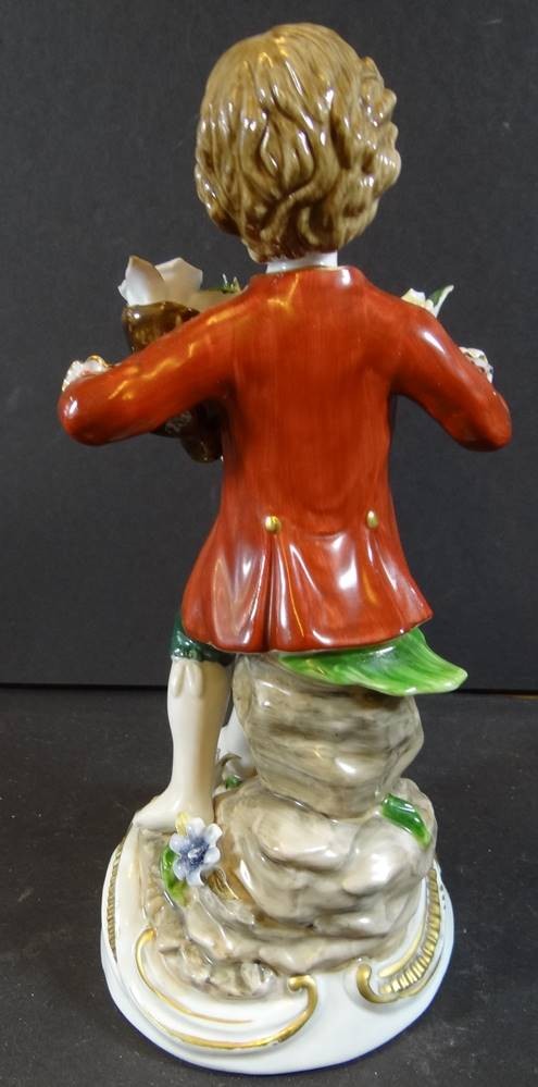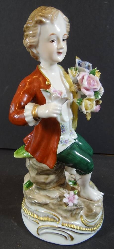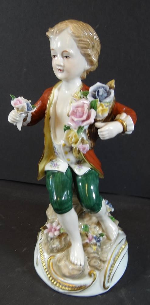 hohe Figur "Rosenkavalier" bemalt, ungedeutete Schwertermarke?, H-22 cm, ein Blatt beschädigt, [1]