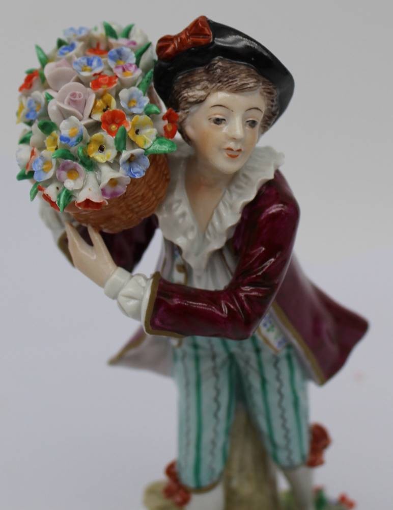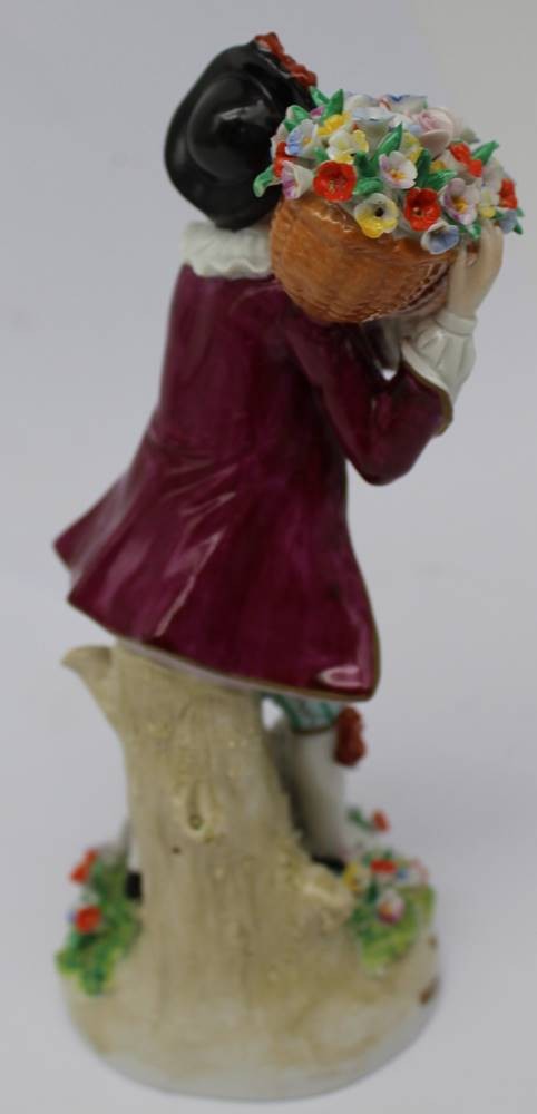 hohe Porzellanfigur "Gärtnerjunge mit Lqamm", Sitzendorf um 1960, GDR H-19 cm, Blütenblätter div. Absplitterungen