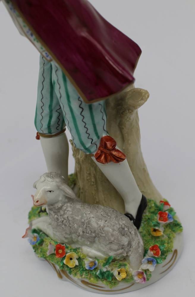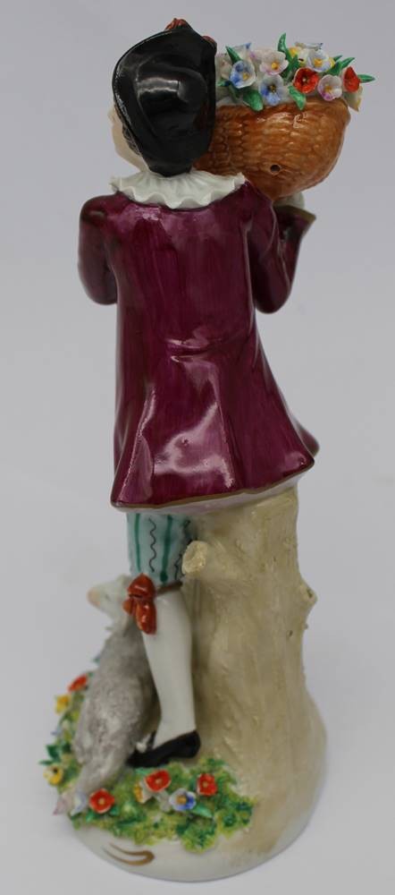 hohe Porzellanfigur "Gärtnerjunge mit Lqamm", Sitzendorf um 1960, GDR H-19 cm, Blütenblätter div. Absplitterungen [1]