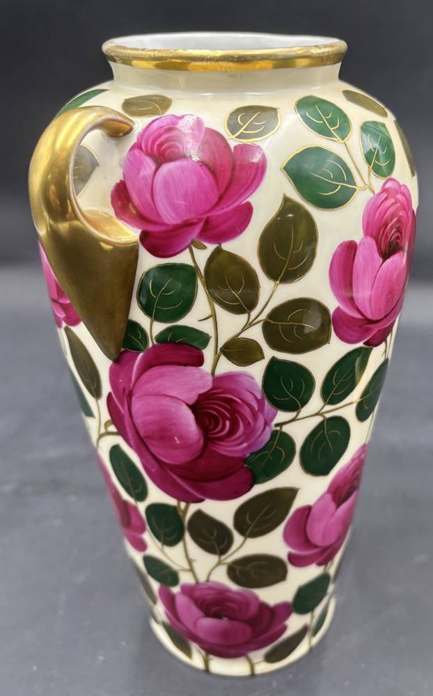 hohe Vase mit Rosendekor Z.S.&C. (Zeidler, Schlott & Co.) aus Selb, Bayern. Kriegsjahr 1918 beschriftet, Handmalerei, H24 cm [1]