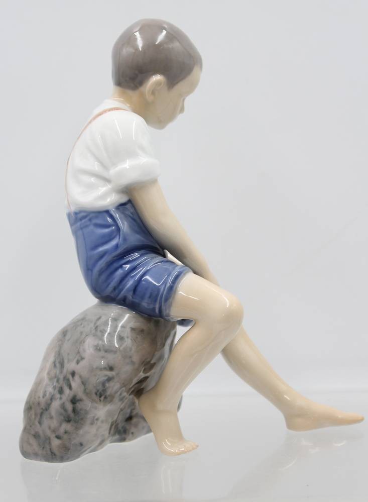 Junge auf Stein sitzend, Bing & Gröndahl, am Sockel monogr. IPI, Entw. Ingeborg Plockross Irminger, Modelnr. 1757, Unterglasurbemalung, H - 19cm [1]