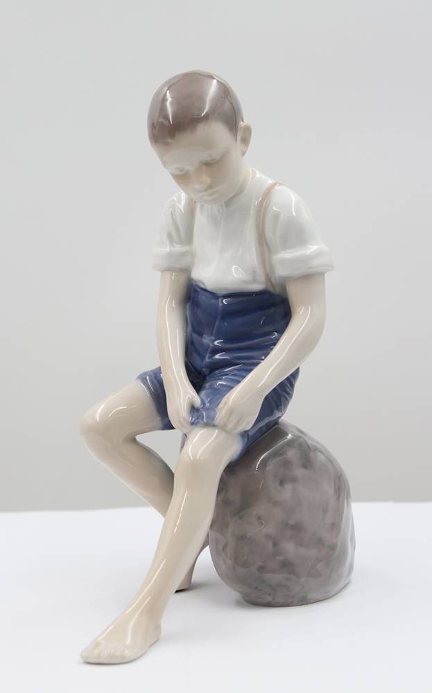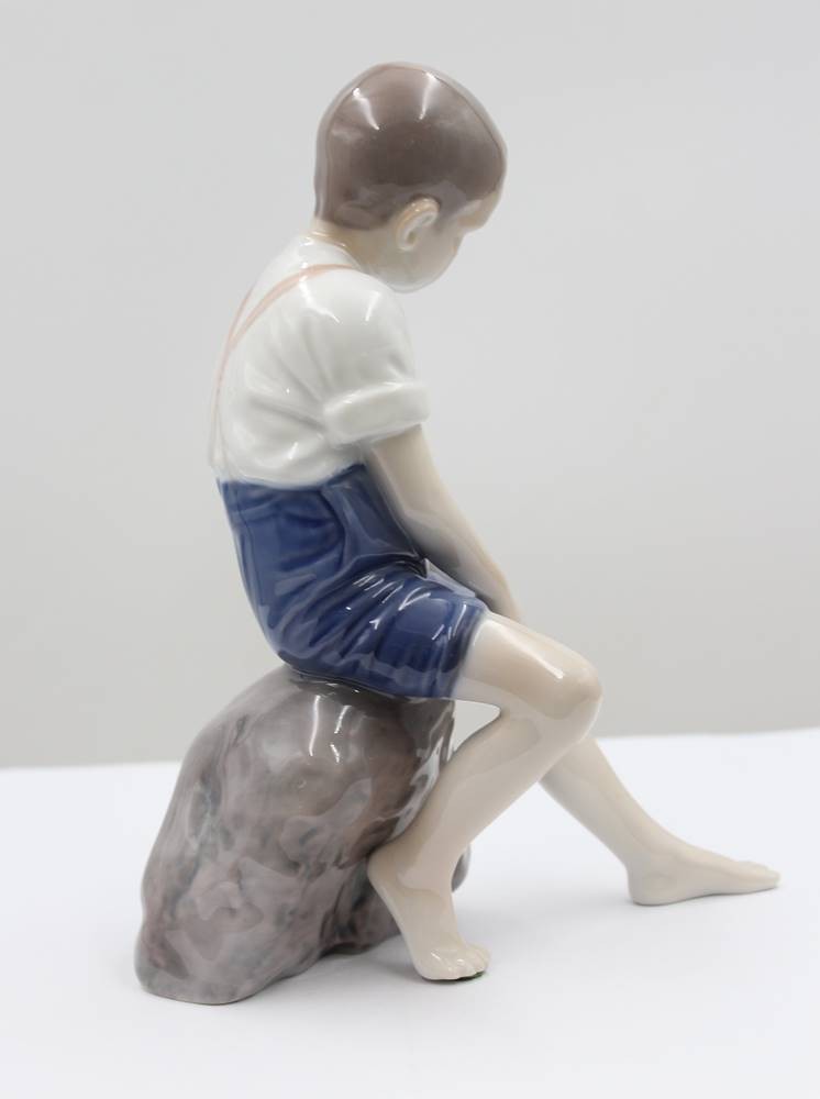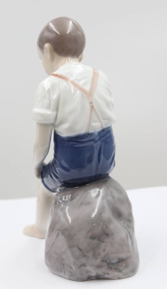 Junge auf Stein sitzend, Bing & Gröndahl, am Sockel monogr. IPI, Entw. Ingeborg Plockross Irminger, Modelnr. 1757, Unterglasurbemalung, H -20cm [1]