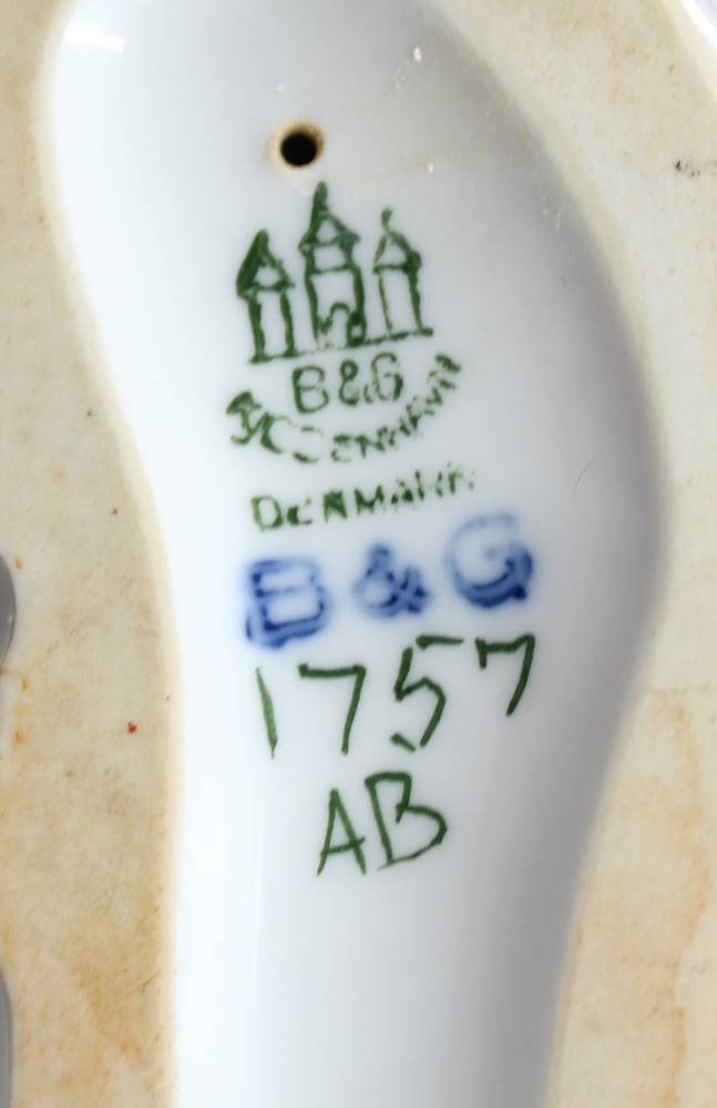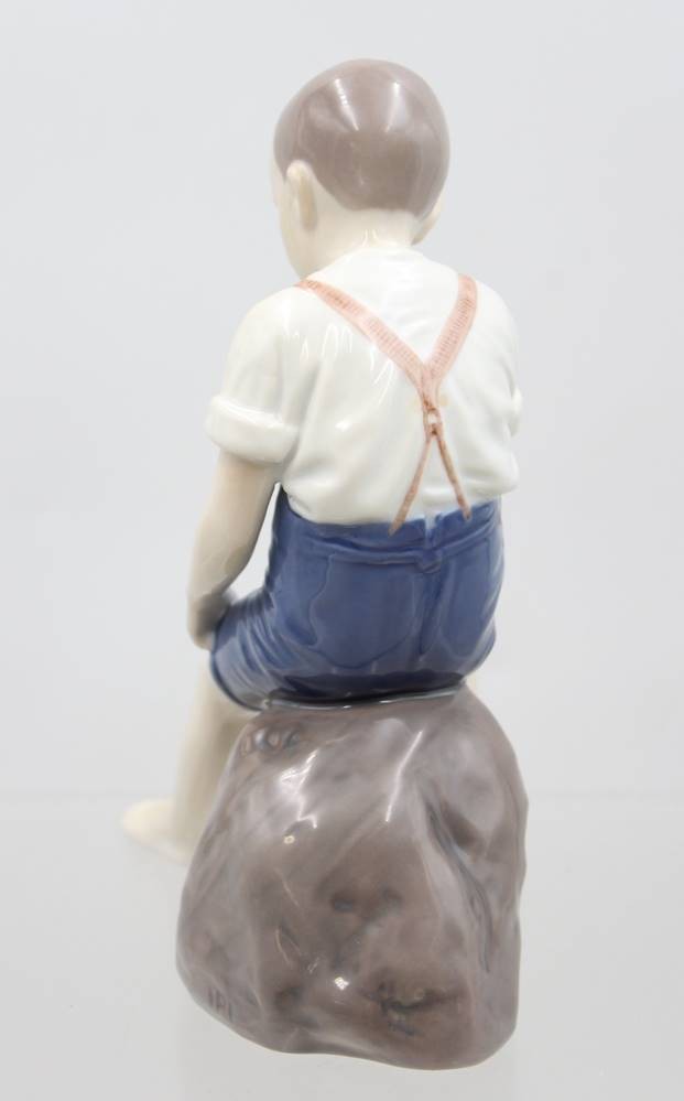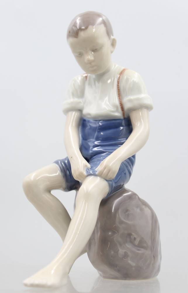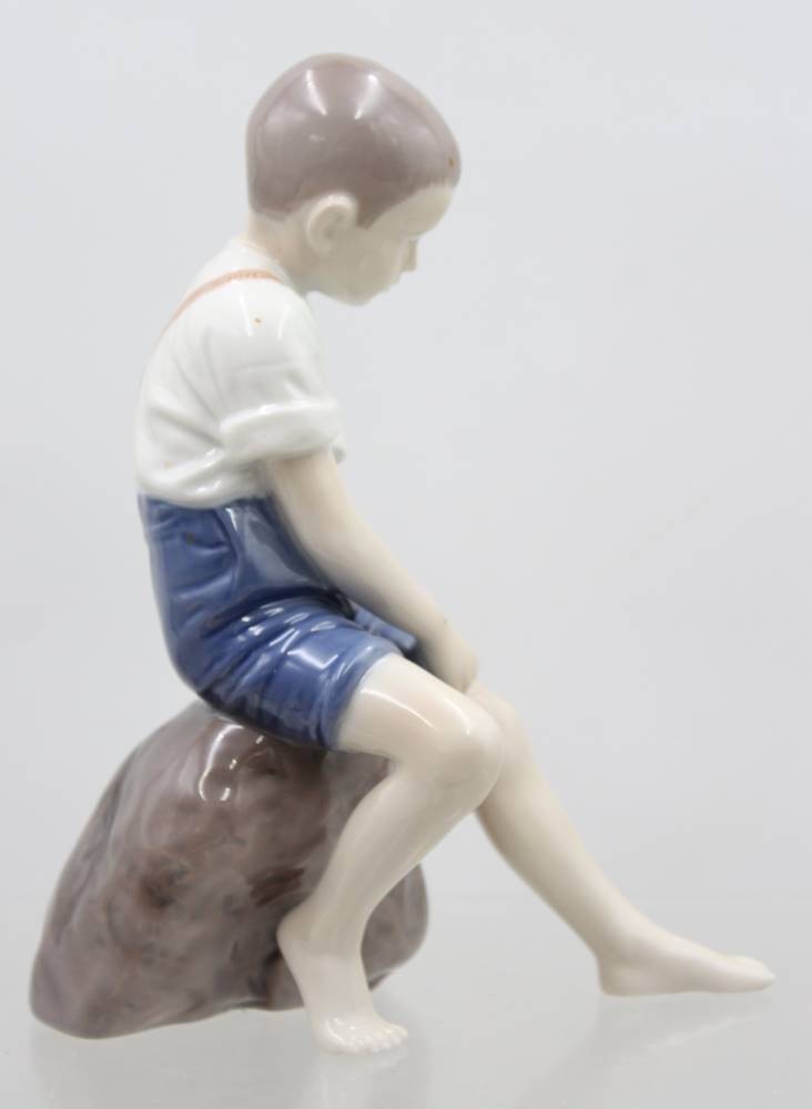 Junge auf Stein sitzend, Bing und Gröndahl, am Sockel monogr. IPI, Entw. Ingeborg Plockross Irminger, Modelnr. 1757, Unterglasurbemalung, H- 19,5cm [1]