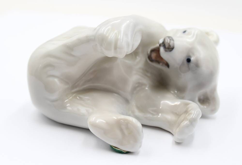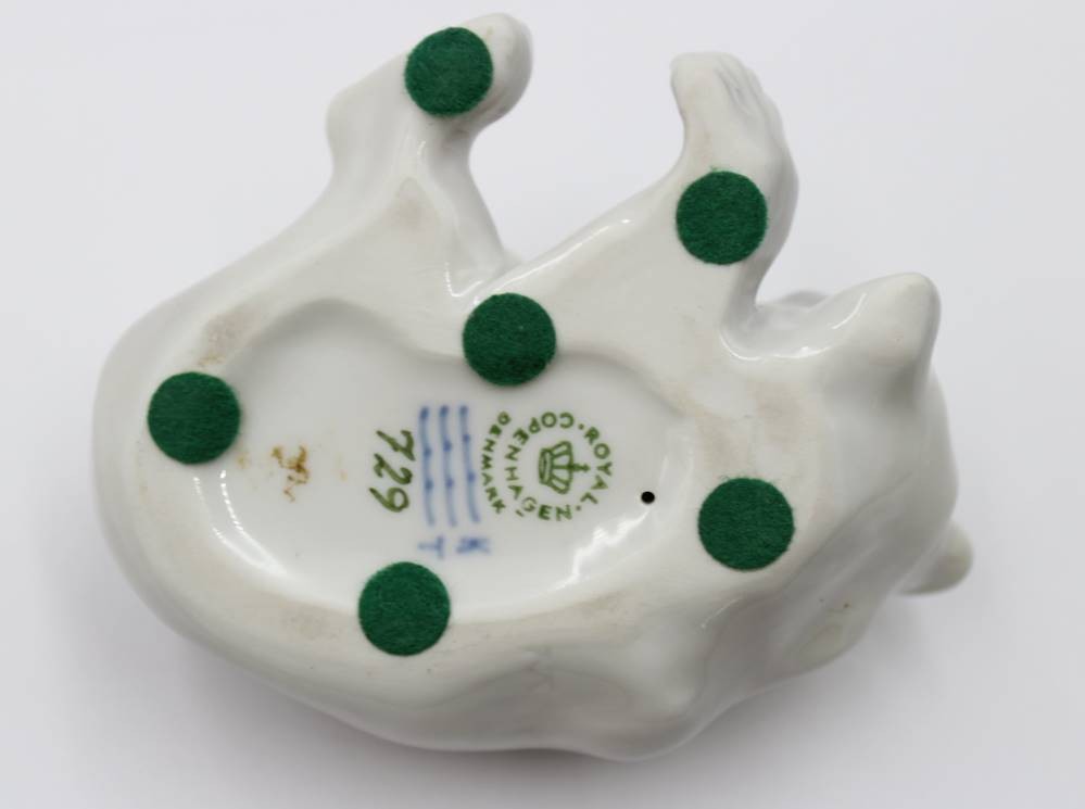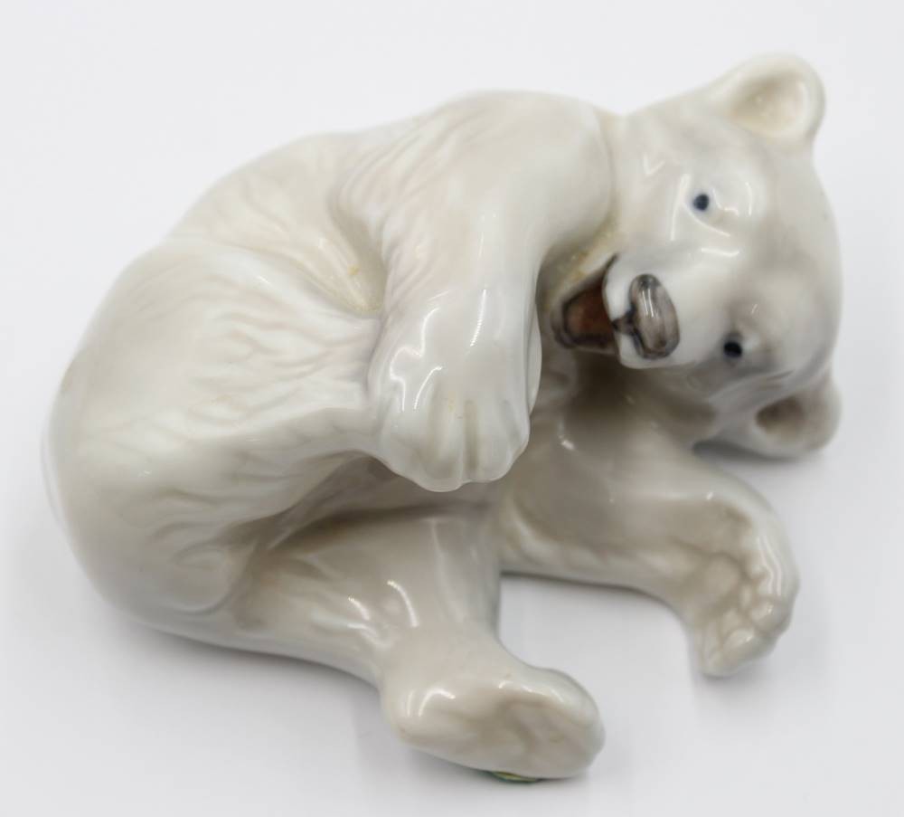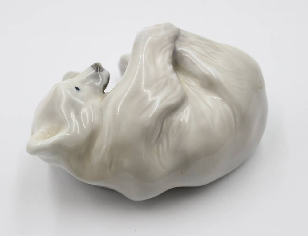 junger tollender Eisbär, Royal Copenhagen, Dänemark, 20. Jhd., Entw. Knud Kyhn 1904, Modellnr. 729, leicht staffiert in Unterglasurfarben, ca. 6 x 12 cm. [1]