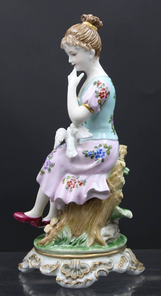 junges Mädchen auf Bank, ungedeutete Blaumarke, polychr. Bemalung, H-26cm, 1x Bestossung am Kleid [1]