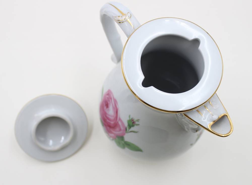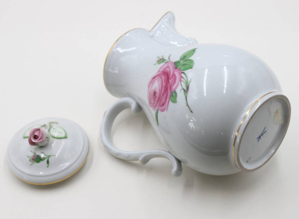 Kaffeekanne, Meissen, Schwertermarke, 2 Schleifstriche, Rote Rose, Deckelblüte (kl. Chip), Deckel innnen bestossen, ca. H-23,5cm [1]