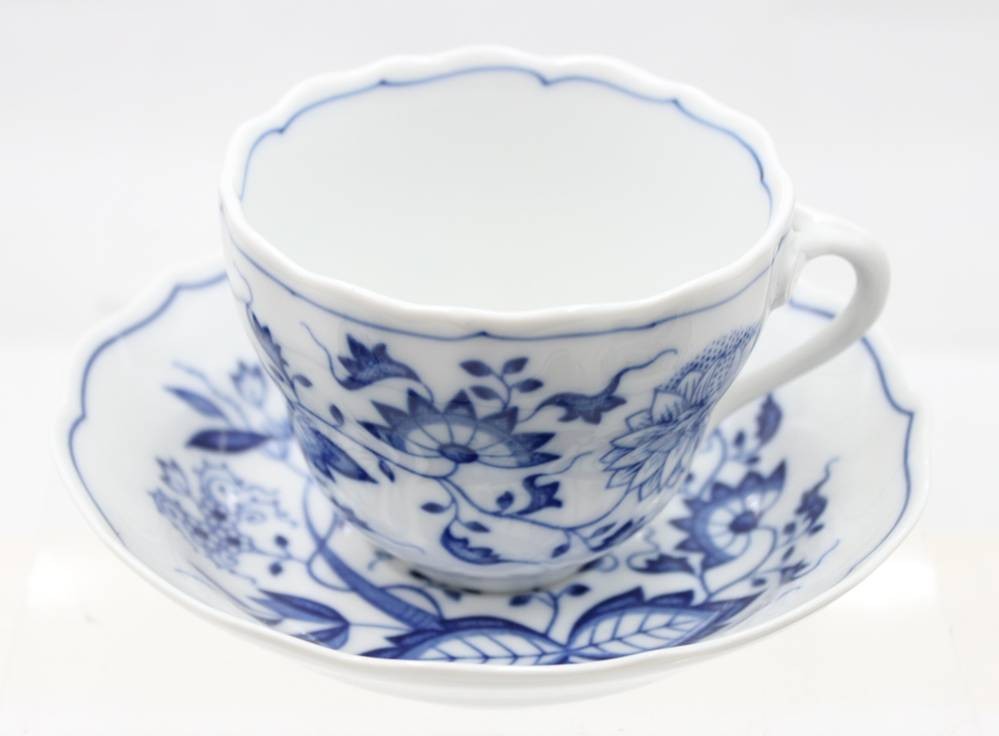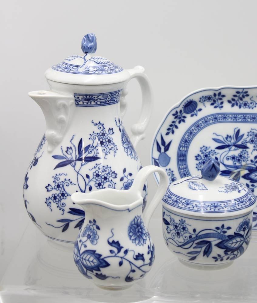 Kaffeeservice für 6 Personen, Hutschenreuther, Zwiebelmuster, Kaffeekern, 6 kompl. Gedecke, Tortenplatte, ovales Tablett und 6 Eierbecher, Kanne H-ca. 23cm, Tassen H-6,5cm [1]