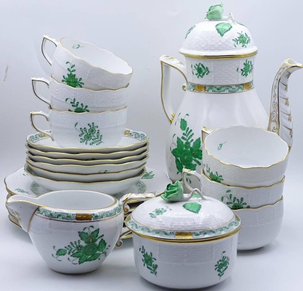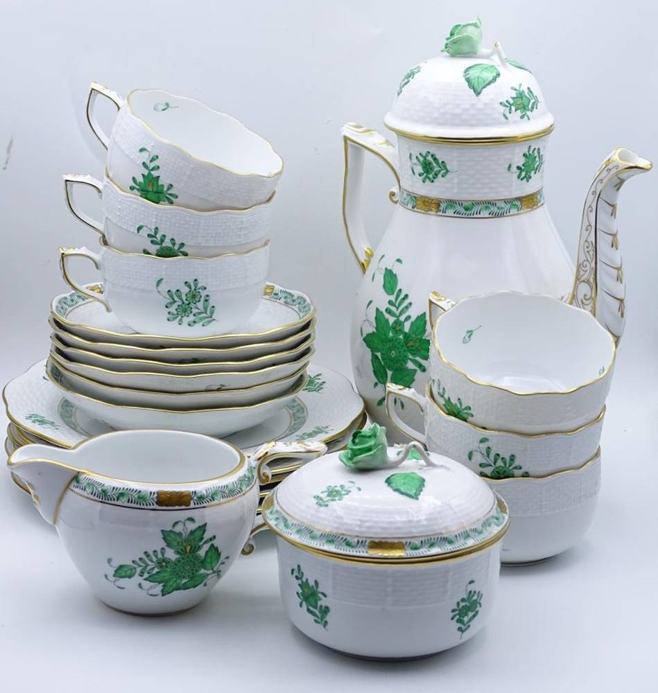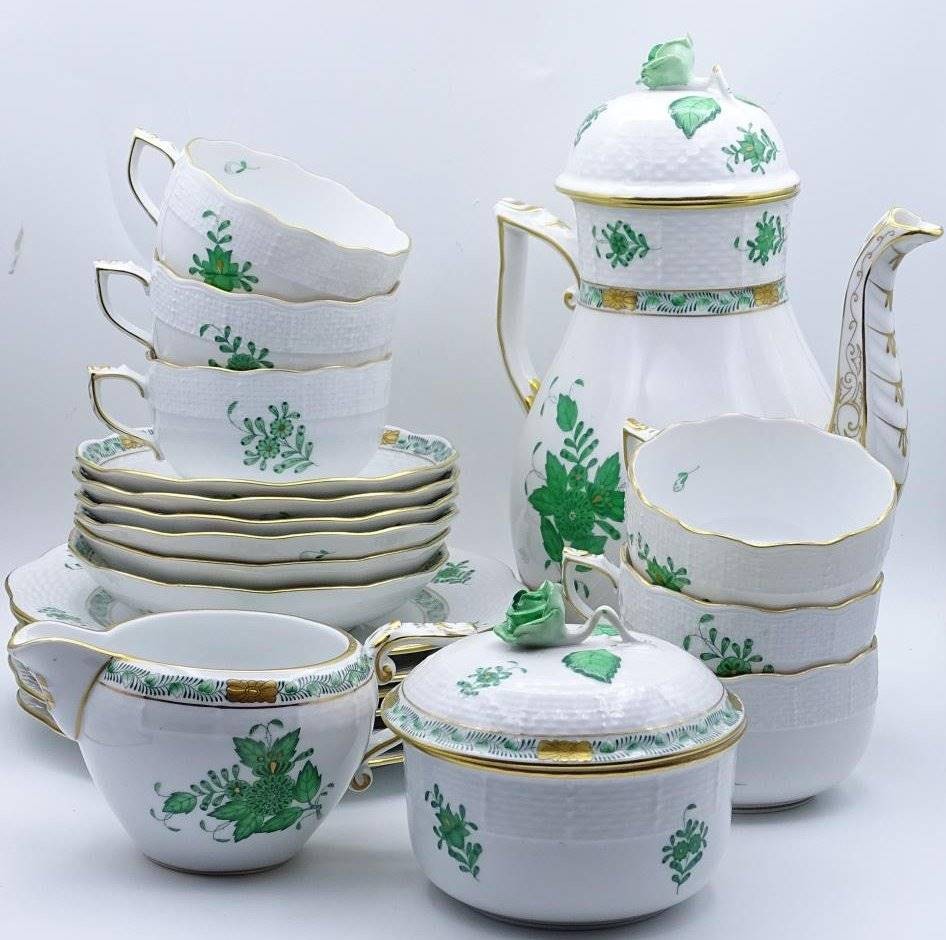 Kaffeeservice "Herend" Apponyi grün, für 6 Personen, 21 Teile, H-Kanne 24 cm, Blüte auf Zuckerdose min. bestossen