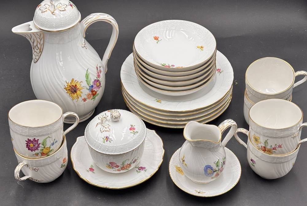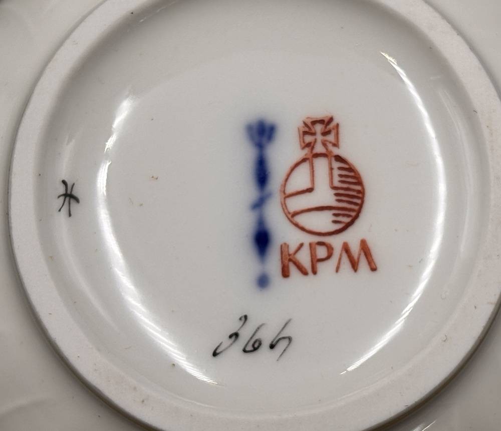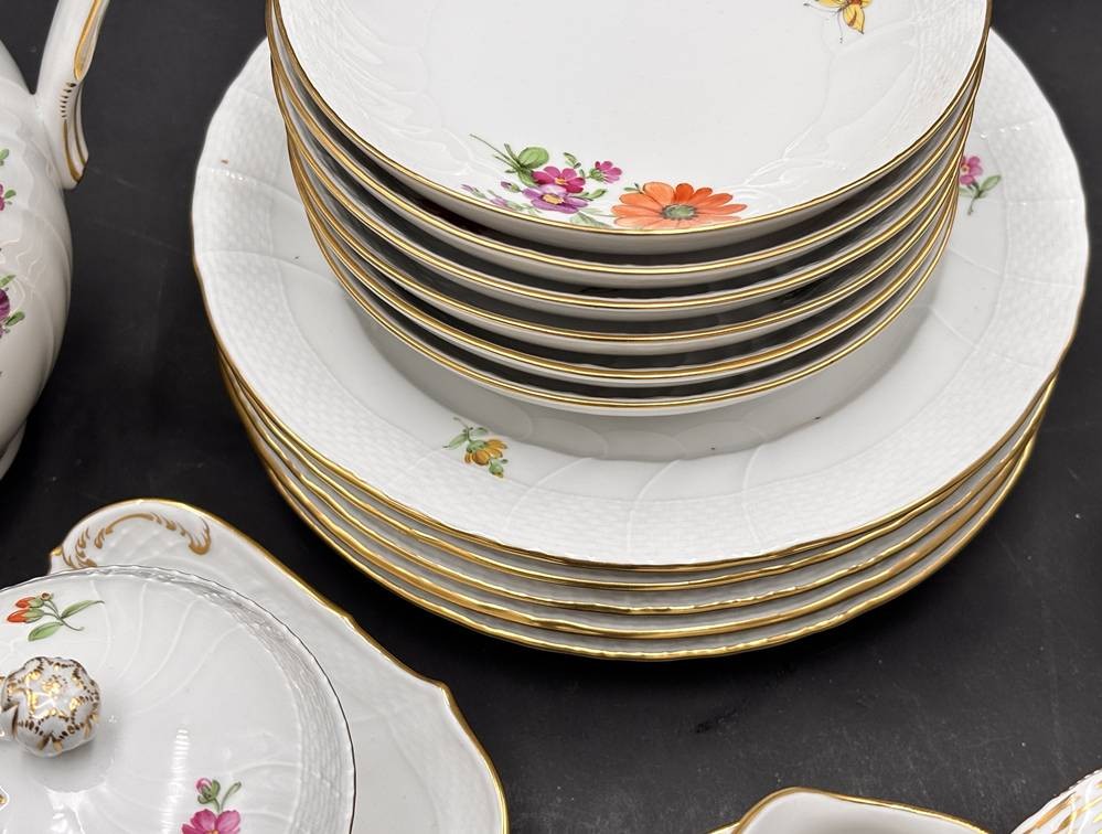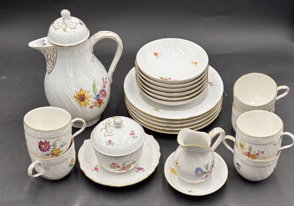 Kaffeeservice "KPM" Berlin, Reliefdekor Neuozier, farbige Bemalung, Goldstaffage, Blumen-und Insektendekor, Zepter und Reichsapfelmarke, Kaffeekern mit 6 Tassen, 6 U.T., 5 Kuchenteller, 2 Schälchen [1]