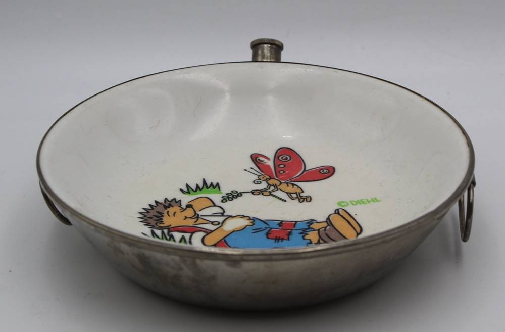 Kinder Warmhalteschale mit Mecki, H-5 cm, D-18,5 cm, anbei Zwiebelmuster Warmhalteschale, beschädigt, Ablass fehlt [1]