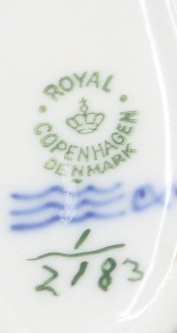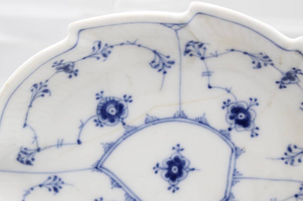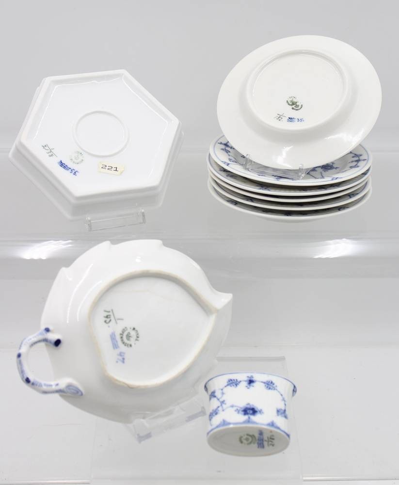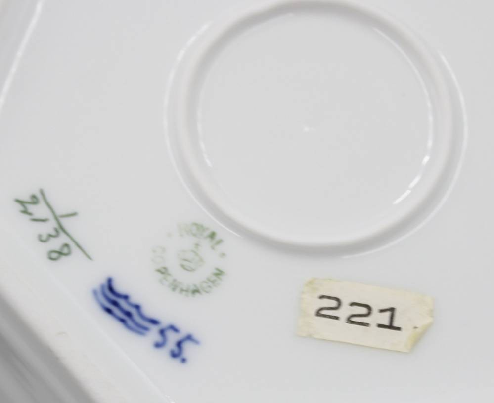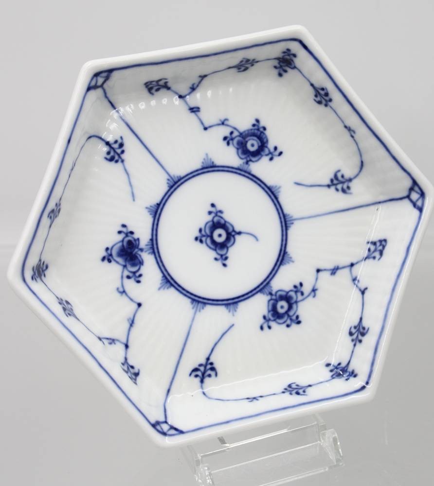 kl. Konvolut Royal Copenhagen, Musselmalet Glat, eckige Schale, Zahnstocherbehälter, Blattschale (altrissig), 6x kl. Teller (D-14cm) [1]