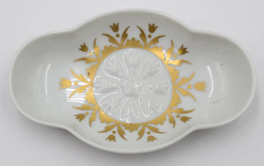 kl. Schälchen, Hutschenreuther, Reliefdekor und Goldzier, L-12,5cm [1]