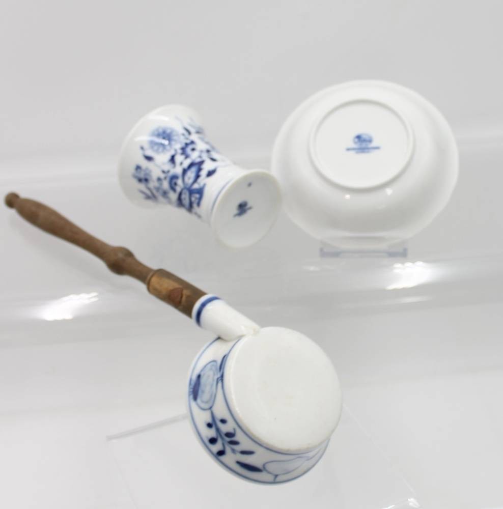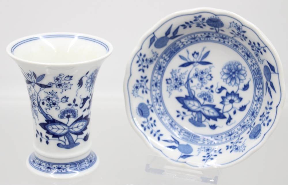 kl. Vase und Schale, Hutschenreuther Zwiebelmuster, anbei Butterpfännchen, Vase H-10cm, Schale D-13cm [1]