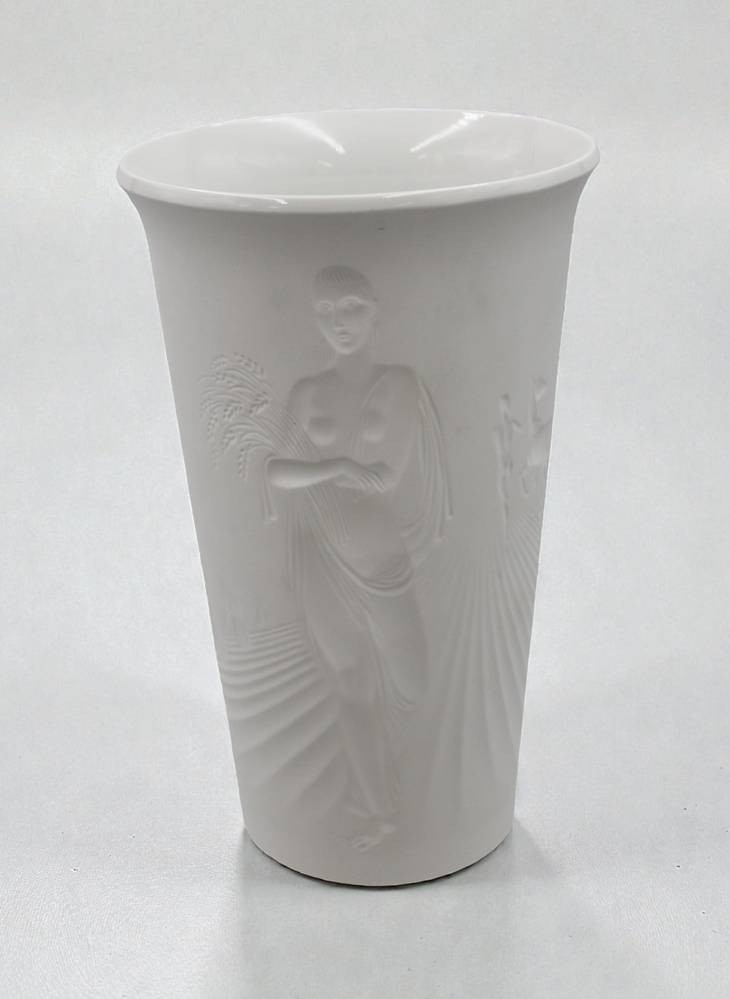 KPM Berlin Porzellanvase, Erntebecher, Biskuitporzellan, Wandung umlaufend mit Reliefdarstellung, Entw. Siegmund Schütz, 1x Schleifstrich, ca. H-22cm [1]