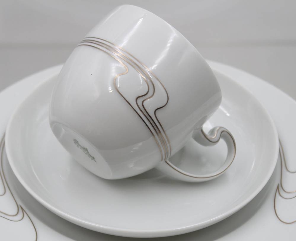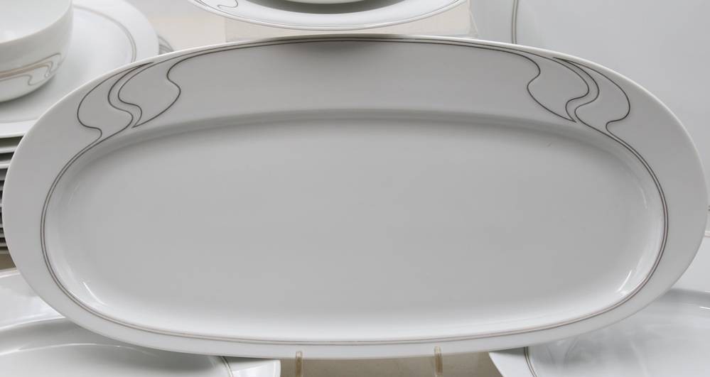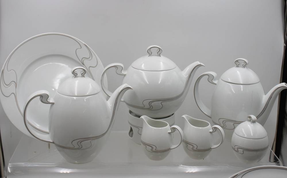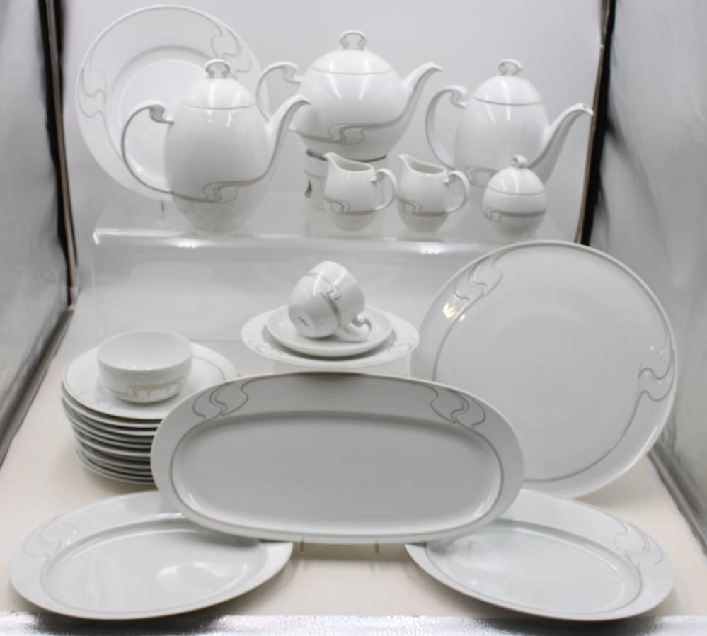 Kservice, Asimmetria Weißgold, Rosenthal, 2x Kaffeekannen, Teekanne, Stövchen, 2x Milchkännchen, Zuckerdose, kl. Schälchen, 5 div. Platten, 12x kompl. Gedecke, 1x Kaffeekanne innen bestossen. [1]
