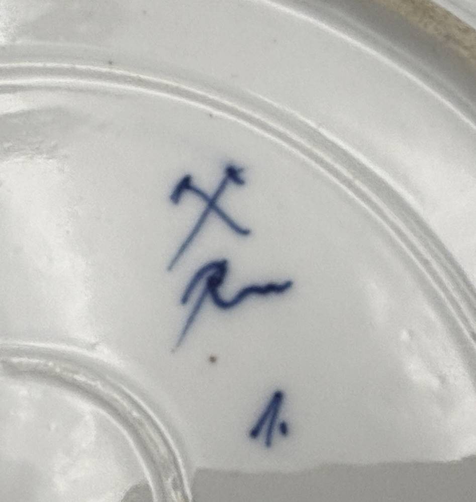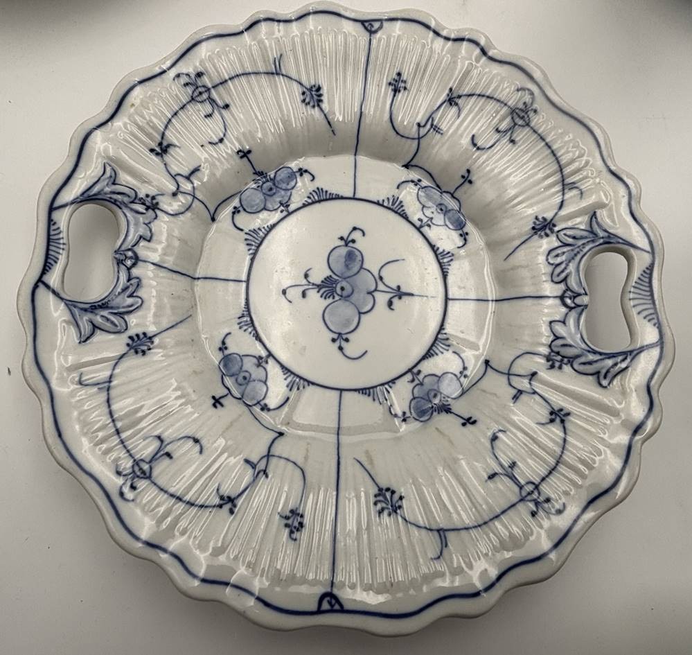 Kuchenteller "Rauenstein" um 1900, D-25 cm, gemarkt mit blauer Fähnchenmarke Rn, Marke von 1890-1930, runde Form mit gewelltem Rand, 2 Handhaben, gerippte Fahne, mit ausgetuschtem Strohblumenmuster bemalt; [1]