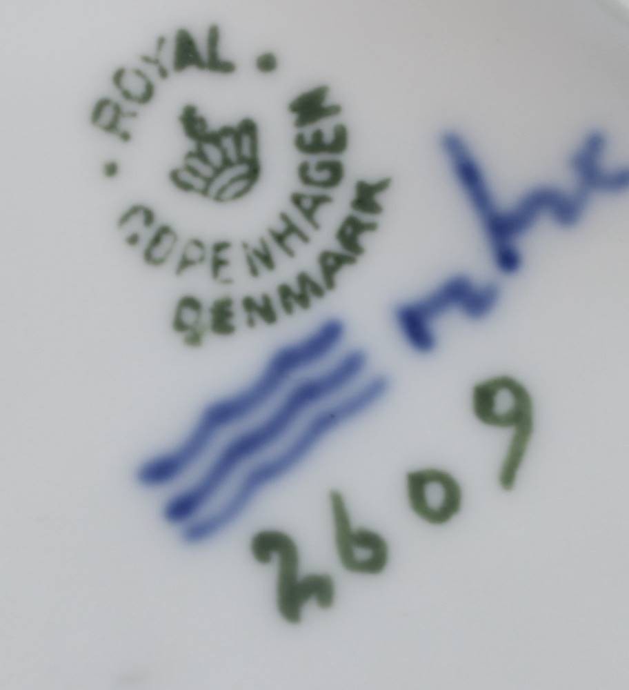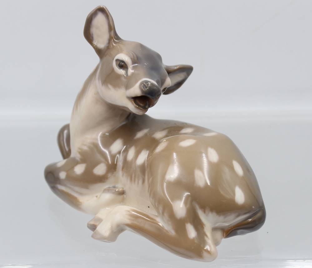 liegendes Rehkitz, Royal Copenhagen, 20. Jhd., Modellnr. 2609, Entw. Knud Kyhn, polychr. Bemalung in Unterglasurfarben, ca. H-12cm B-17cm [1]