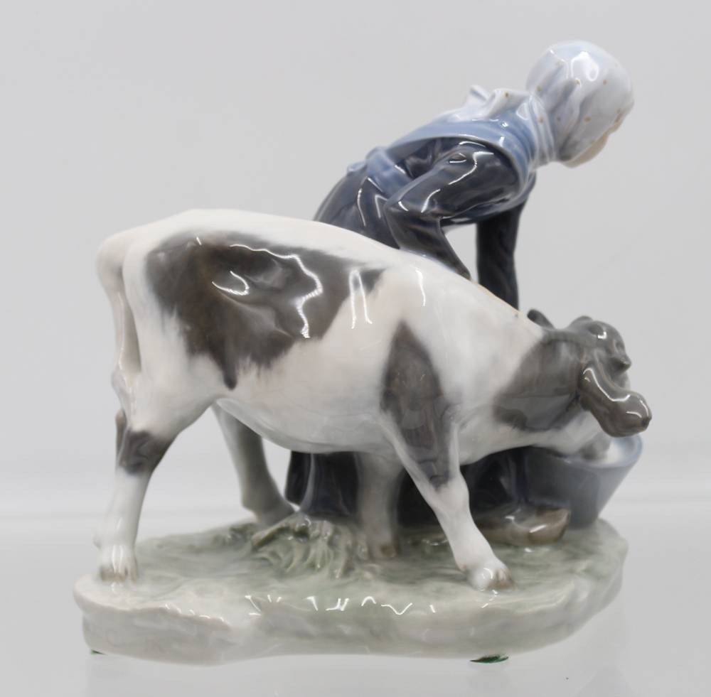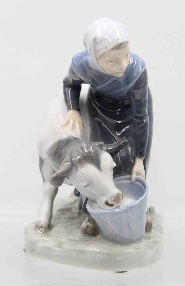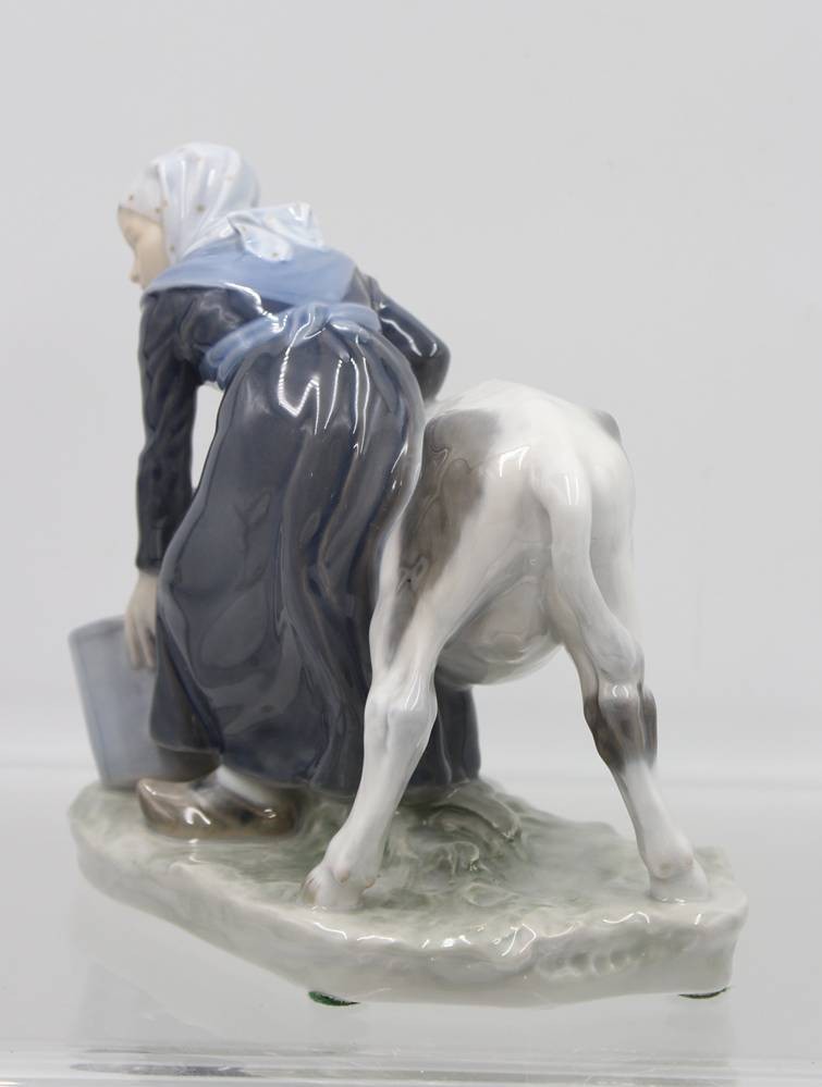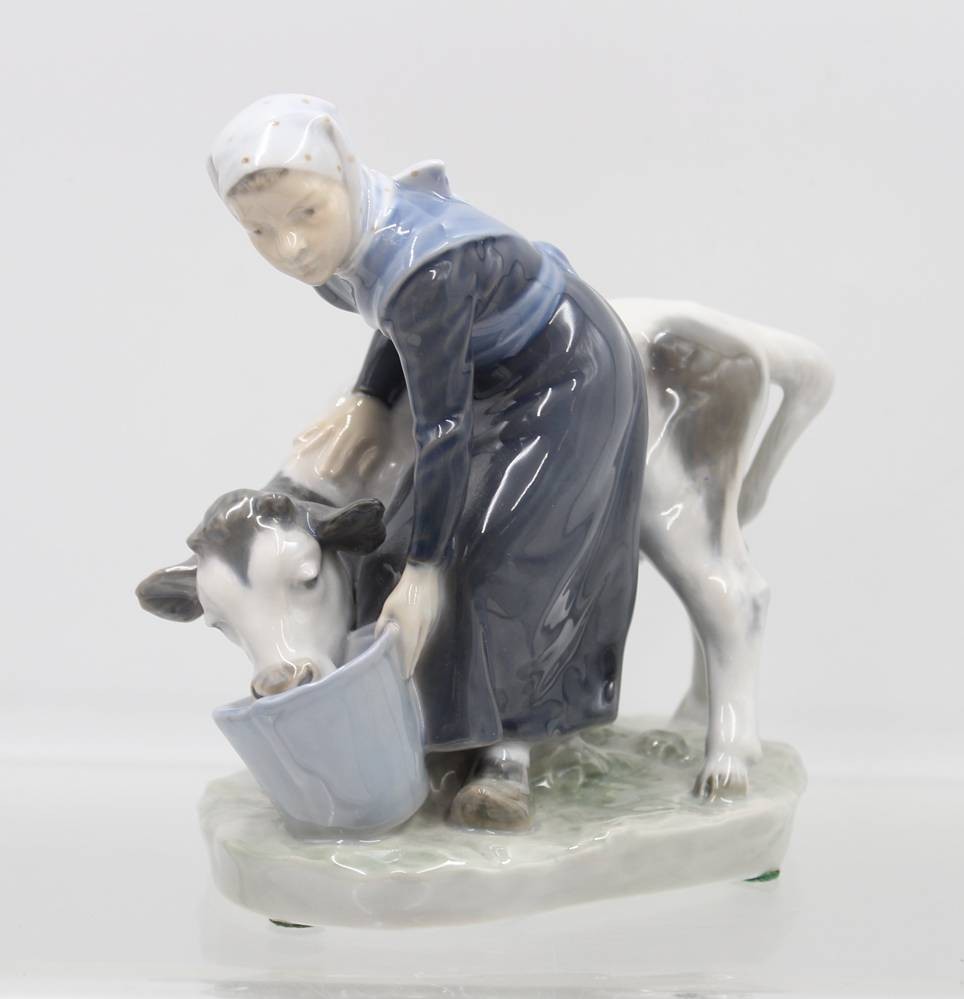Mädchen, das ein Kalb aus einem Eimer füttert, Royal Copenhagen , Entw. Christian Thomsen, Modellnr. 779, H-16cm, L-15,5 cm, 2 Schleifstriche [1]