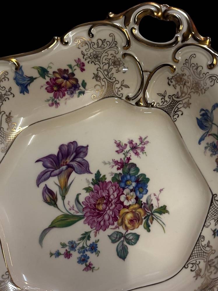 ovale Prunkschale, Elfenbein-Porzellan, florales Dekor mit Goldstaffage, guter Zustand, 31x28 cm, H-9 cm [1]