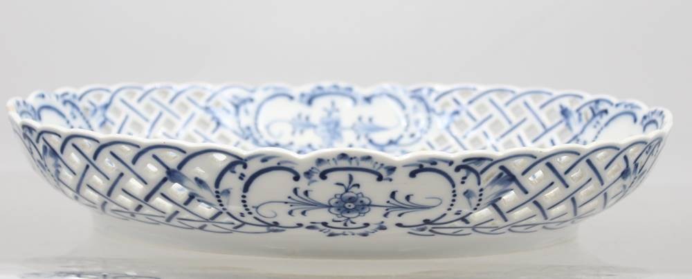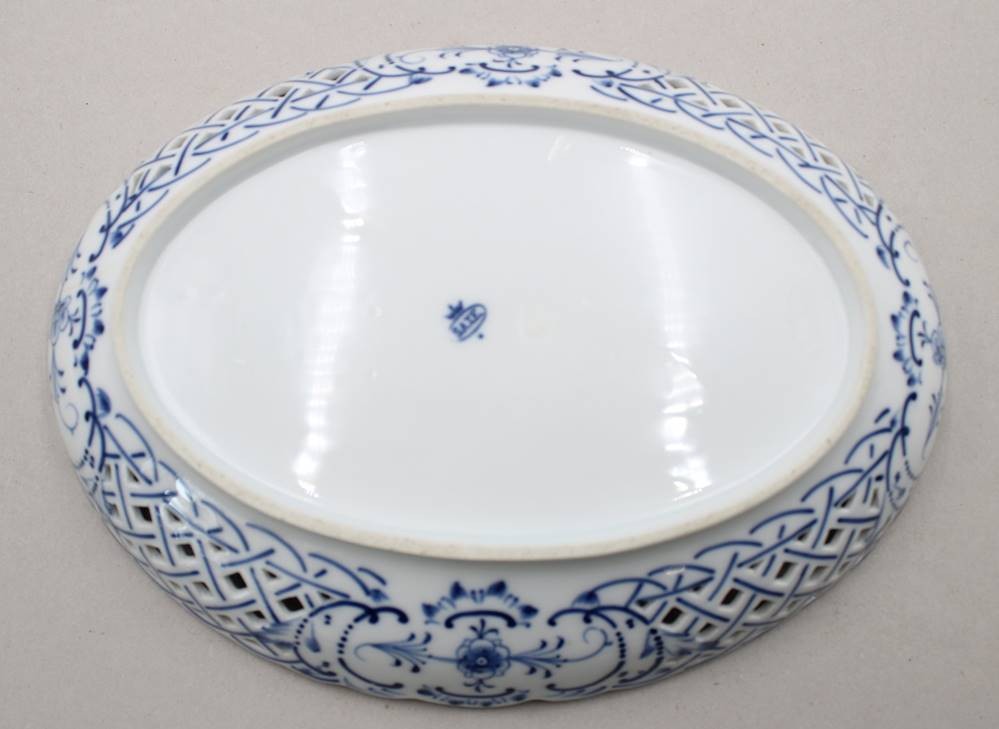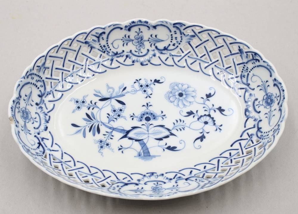ovale Schale, Saxe, Zwiebelmuster, durchbrochen, 1x bestossen, ca. H-5cm , B-28cm [1]