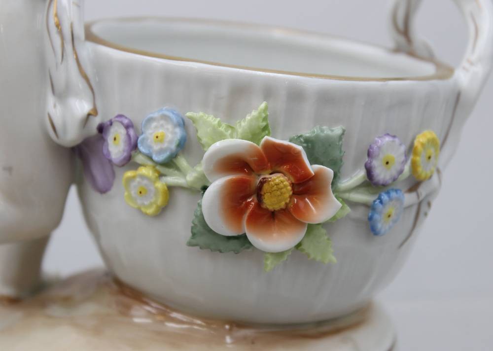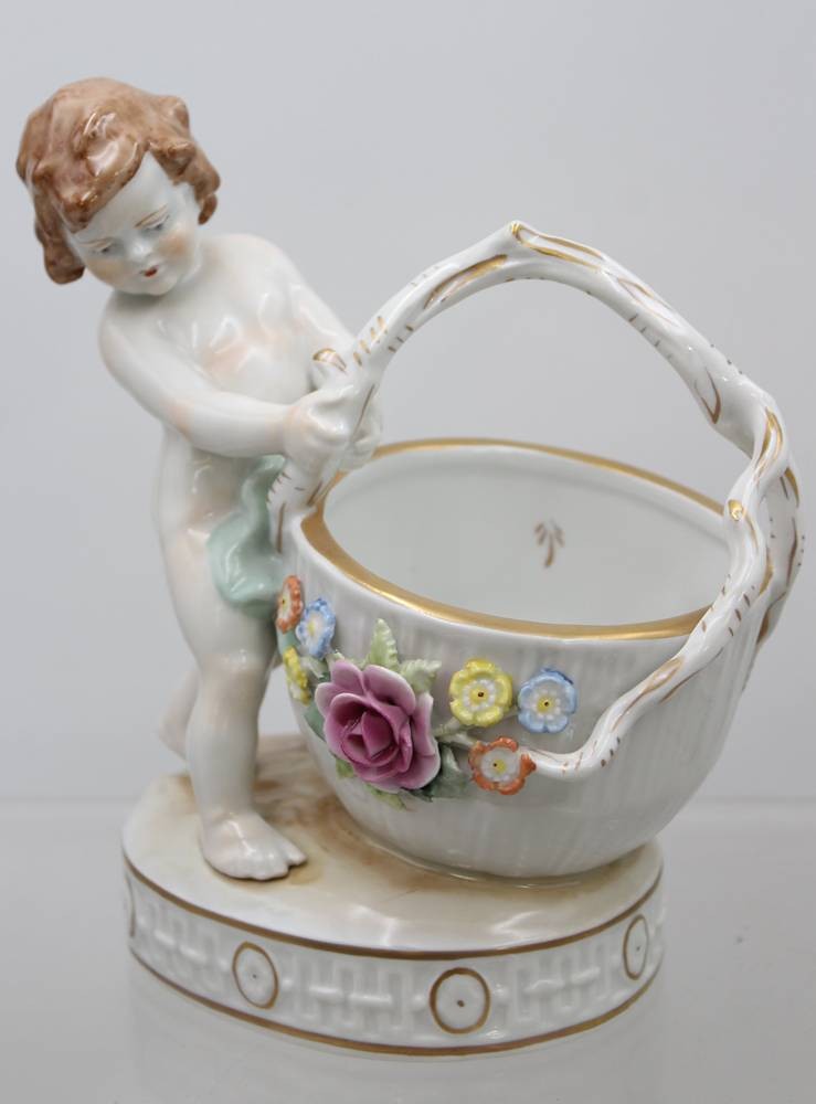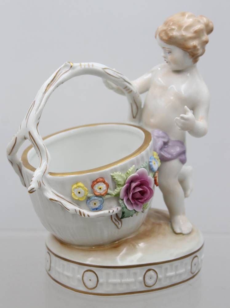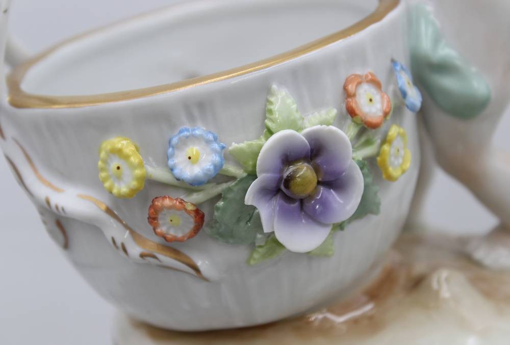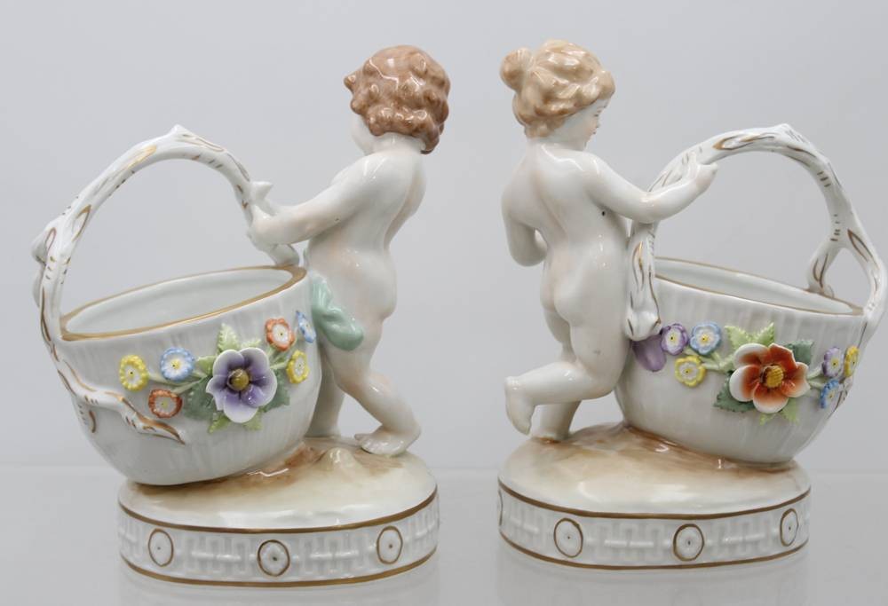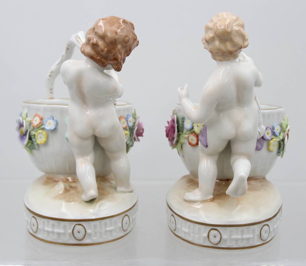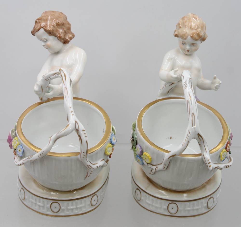 Paar grosse Salieren mit Kinderfiguren, "Schierholz" Plaue, aufgesetzte Blüten, kl. Abplatzer, H-ca. 19 cm [1]