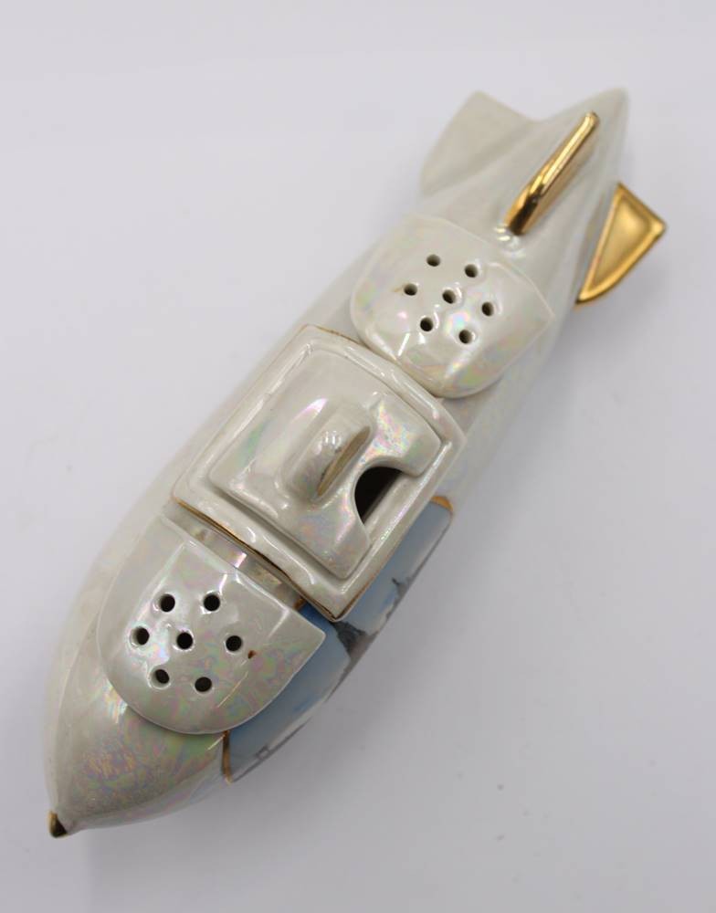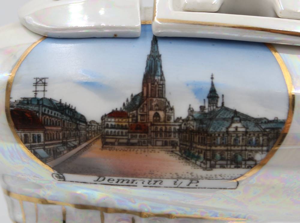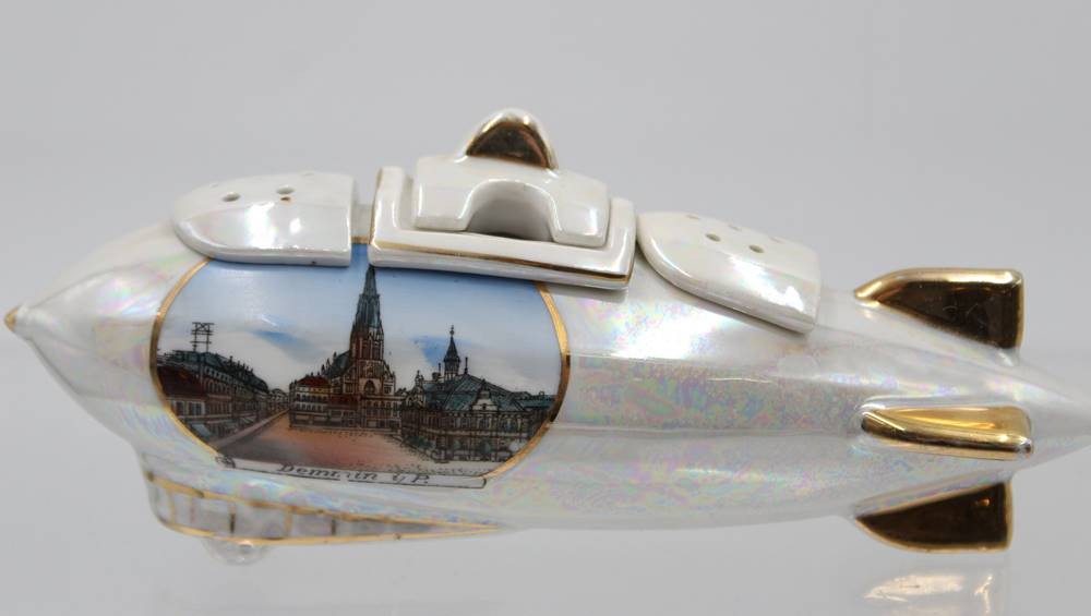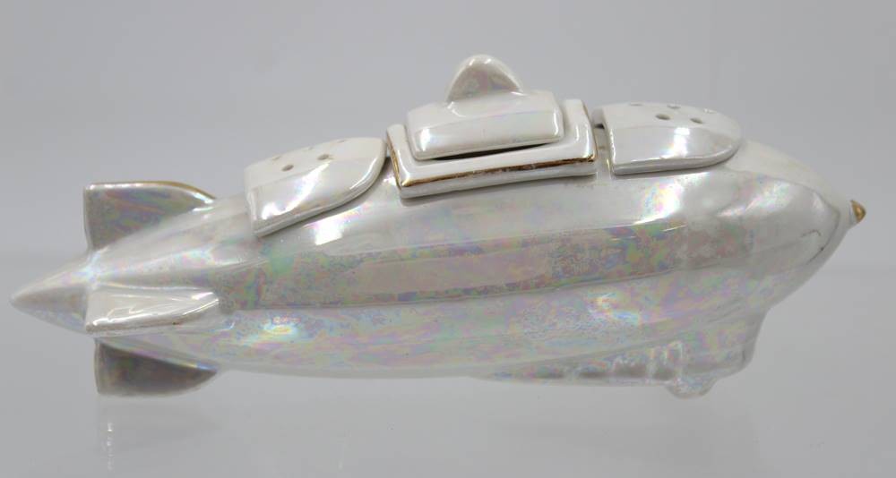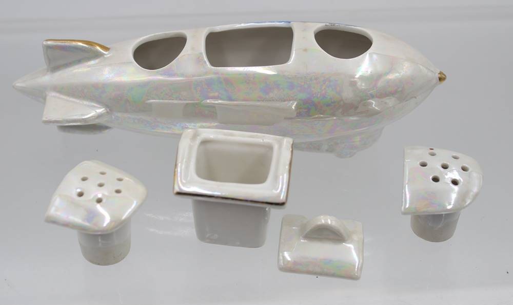 Porzellan-Menagen in Zeppelinform, Ansicht Demin, älter, lüstrierend, ca. H-6,8cm L-17cm [1]