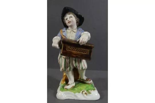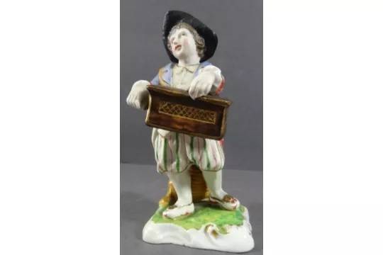 Porzellanfigur, Junge mit Leierkasten, älter, bemalt, H-12,5 cm [1]