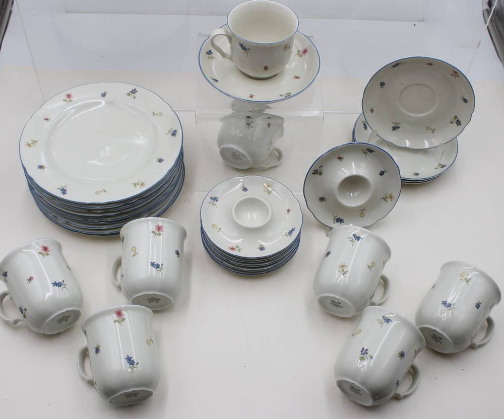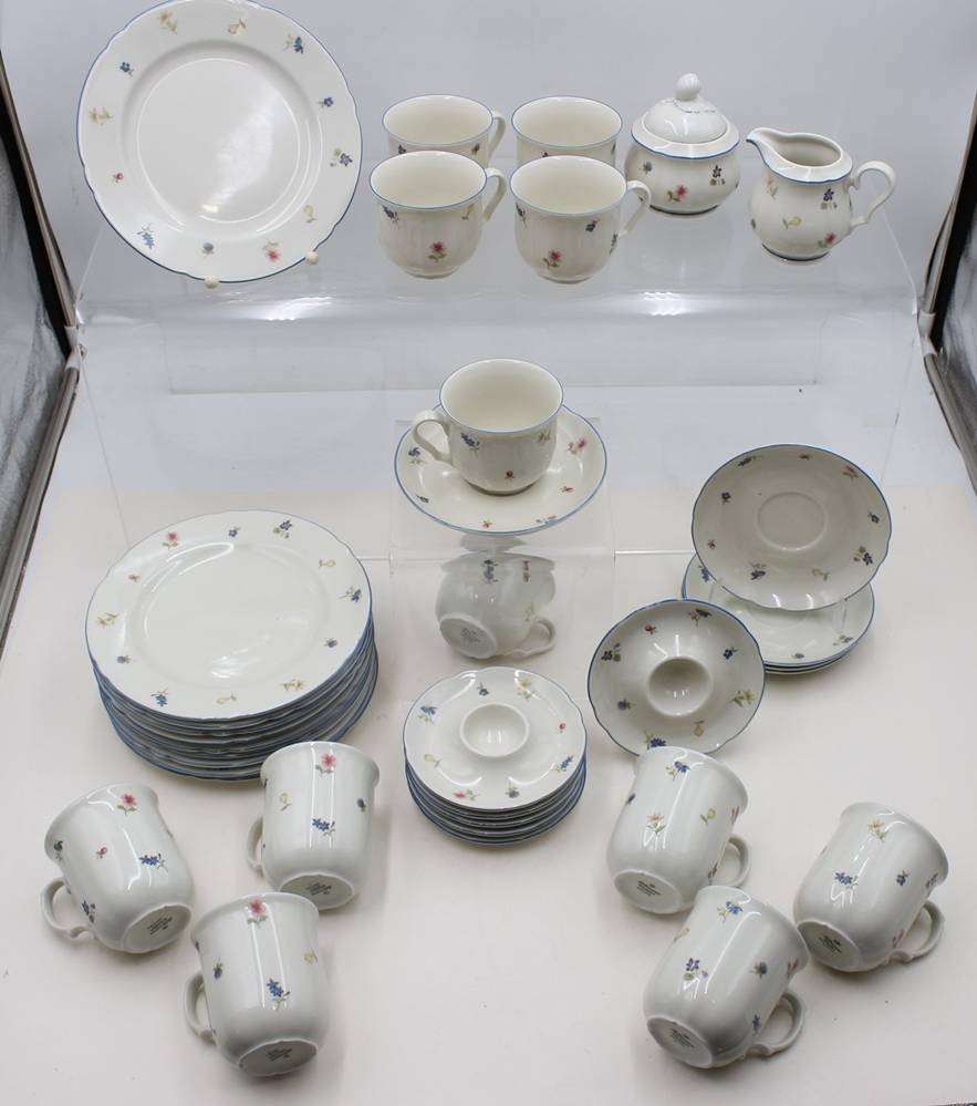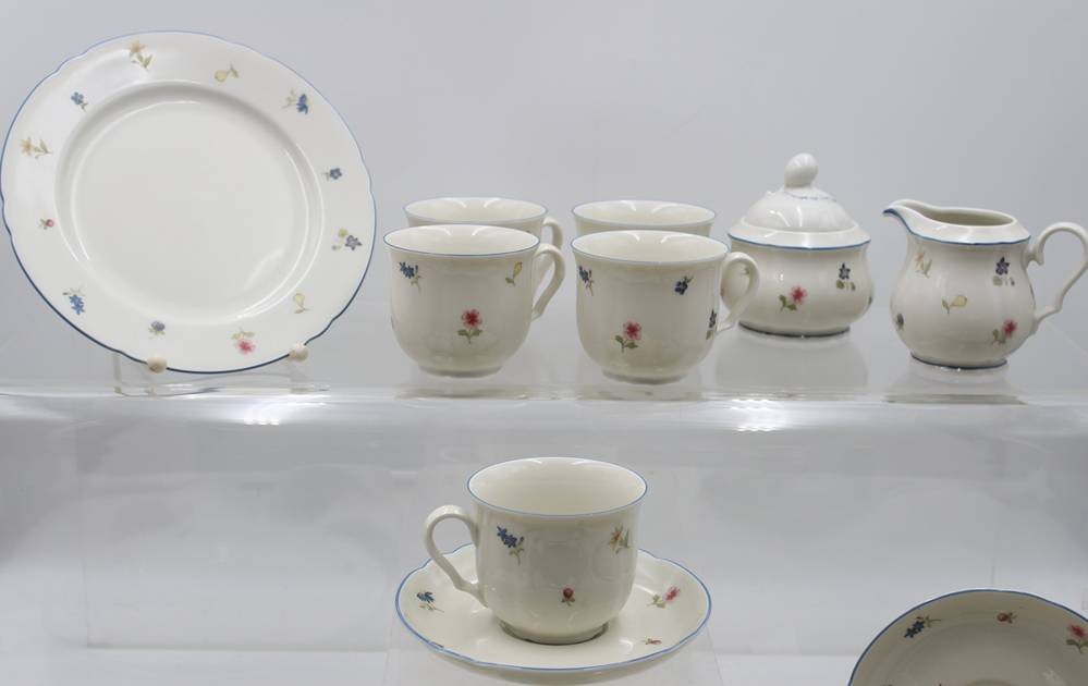 Restservice, Seltmann Weiden, 10x Kuchenteller, 6x Eierbecher, 5x Kaffeetassen mit U.T. (1x Chip), 6x Kakaobecher, Milch und Zucker, [1]