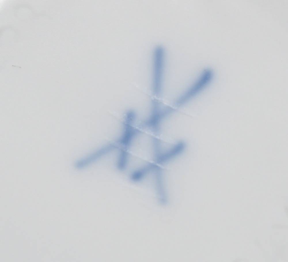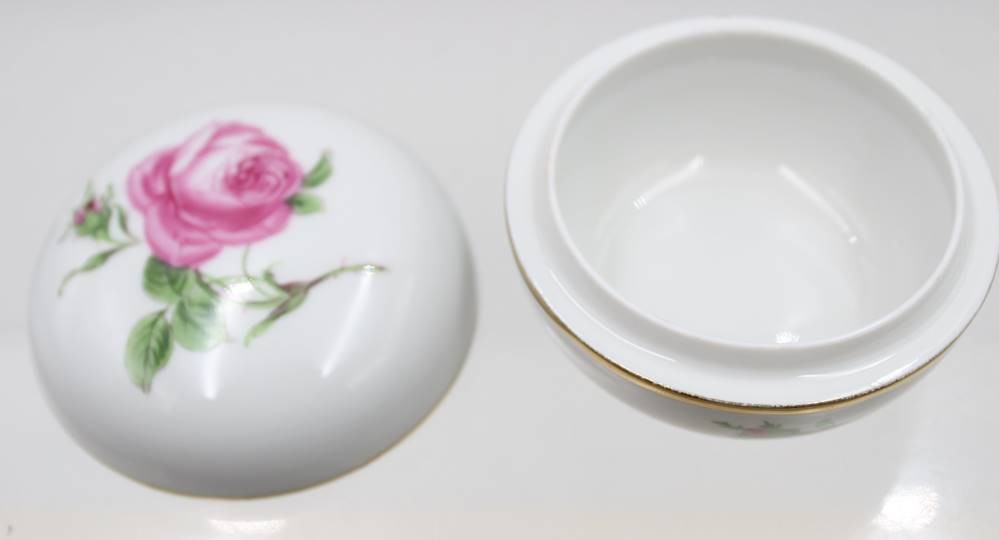 runde Deckeldose, Meissen, Schwertermarke, rote Rose, 3 Schleifstriche, ca. H-5cm D-7,8cm, min. Chip [1]