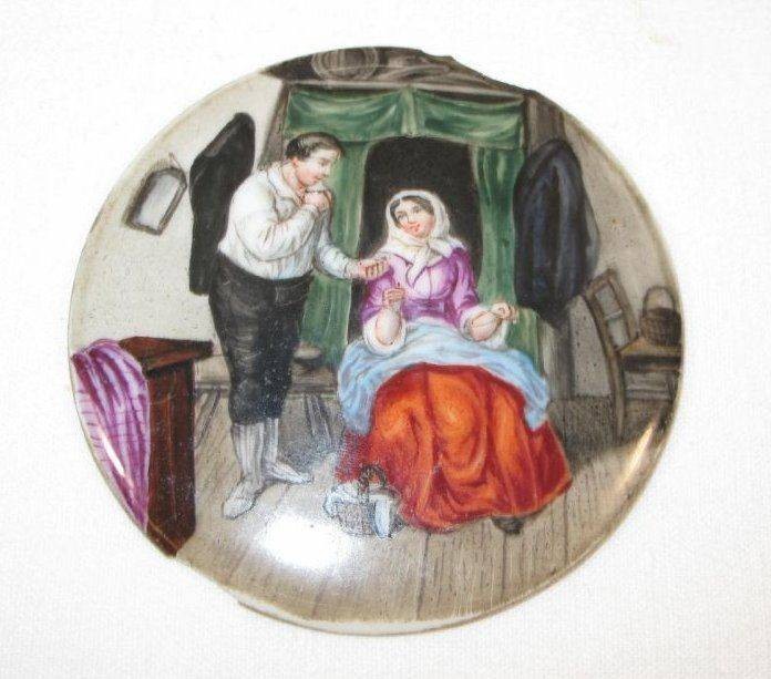 rundes Porzellan-Medaillon, bemalt mit Stubenszene, älter, 2x bestossen, ca. D-7,5cm.