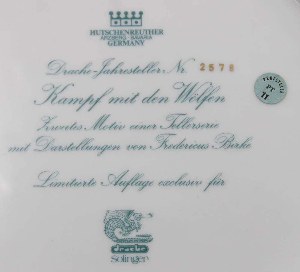 Sammelteller von Hutschenreuther Arzberg Bavaria für "Drache-Solingen", Nr. 2578, Kampf mit den Wölfen (von Fredericus Birke, D-30cm [1]