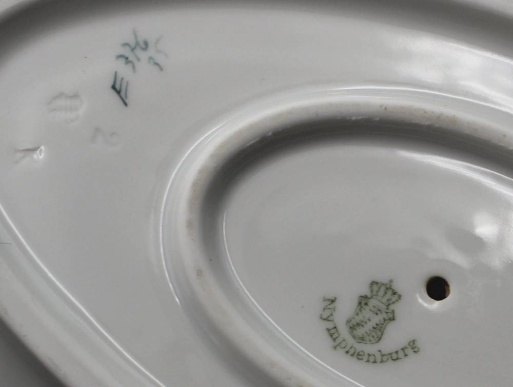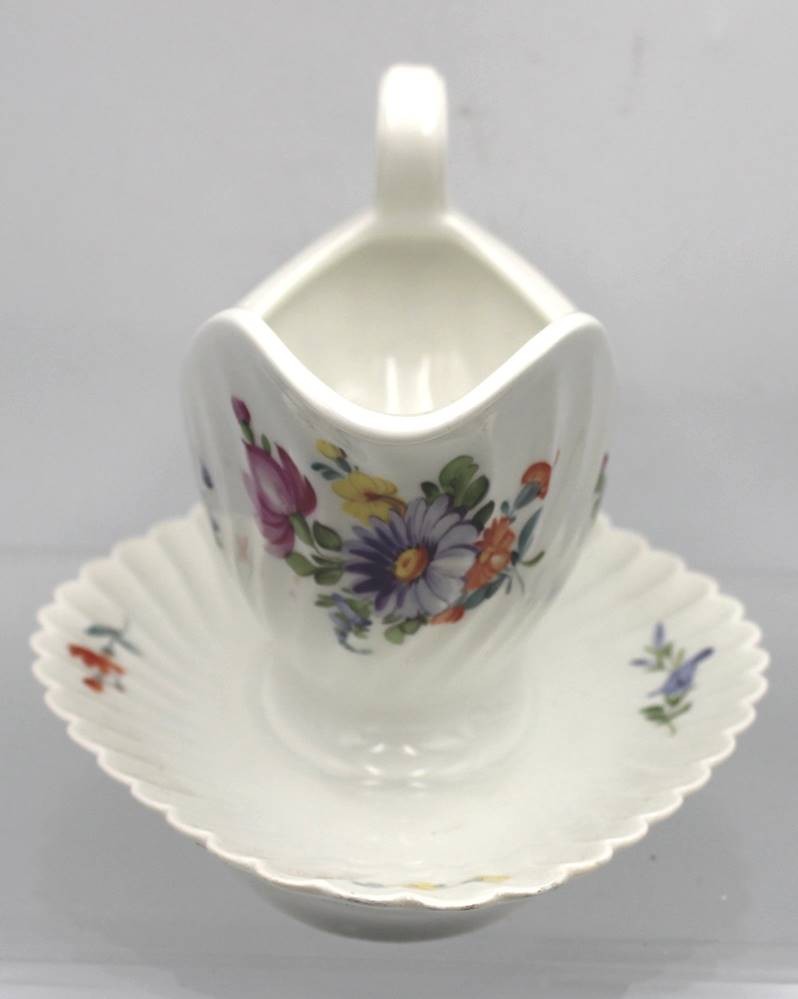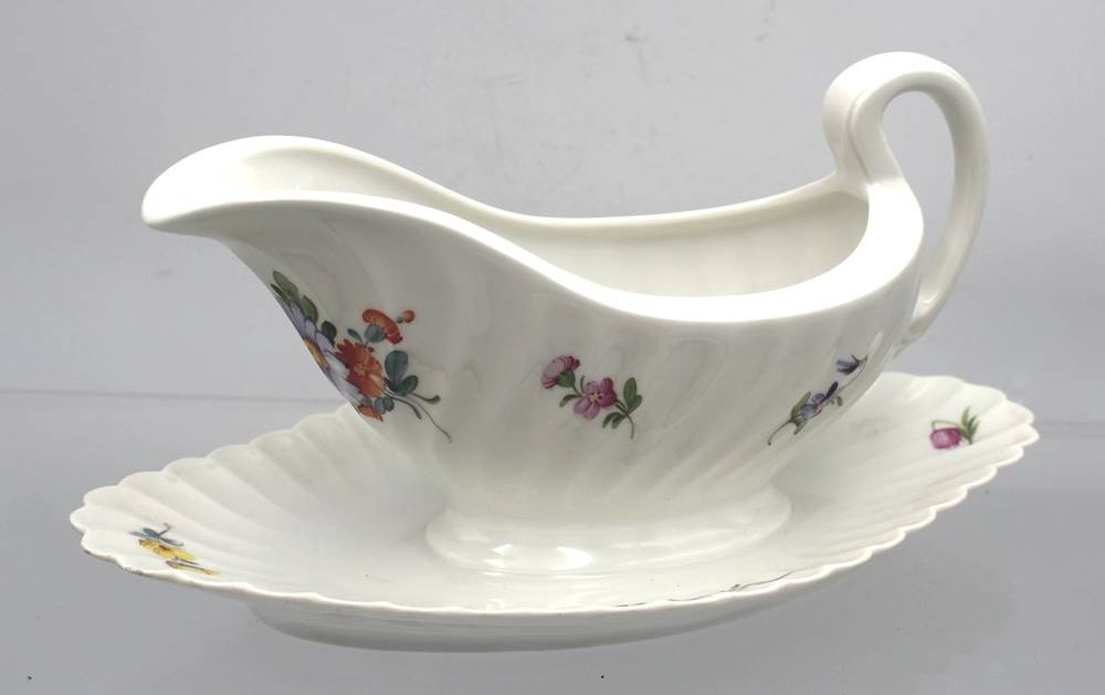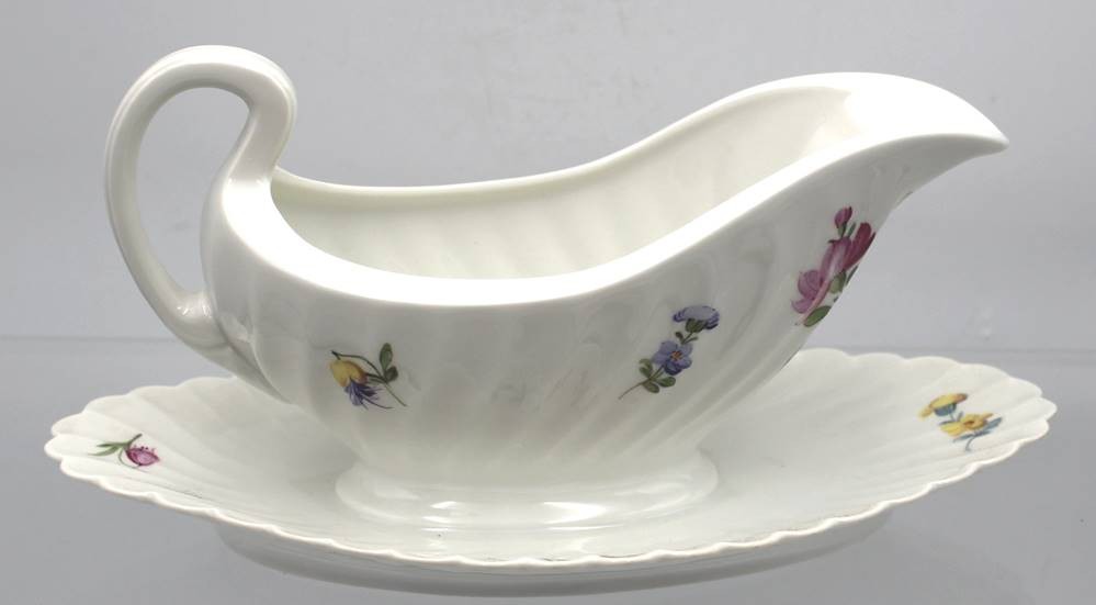 Sauciere, Nymphenburg, Wellenform gerippt 20. Jhd., Blumenbemalung, H-12cm L-25cm [1]