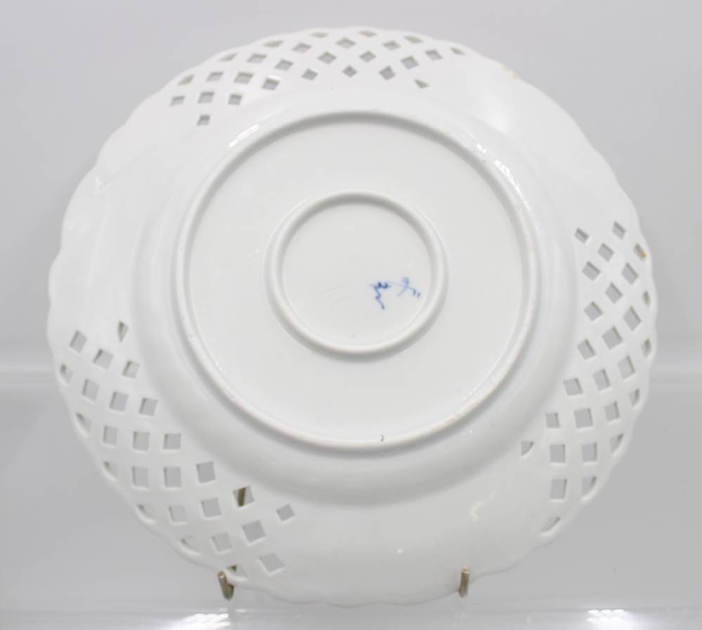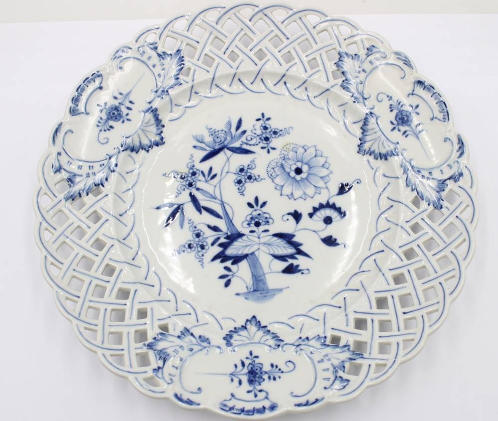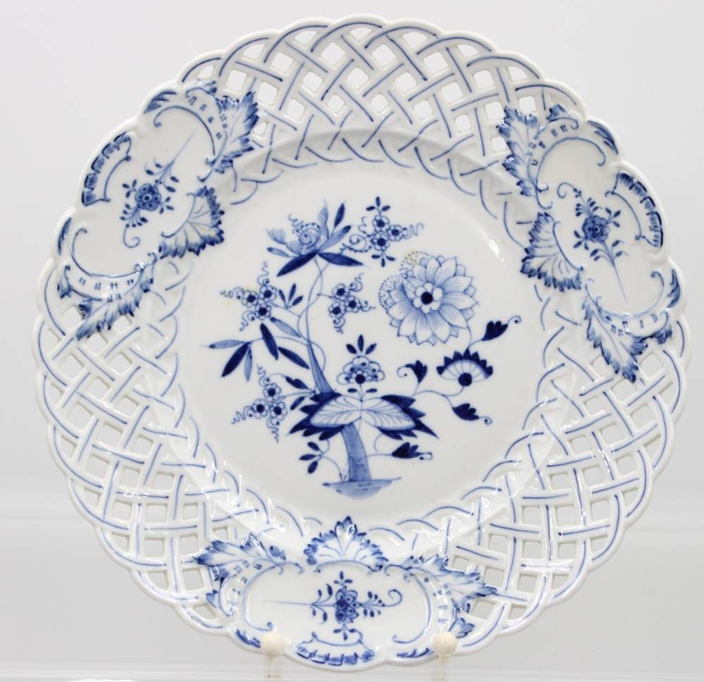 schöner Durchbruchteller, Porzellanfabrik Friedrich Christian Greiner & Söhne in Rauenstein, Zwiebelmuster, ca. D-26,7cm [1]