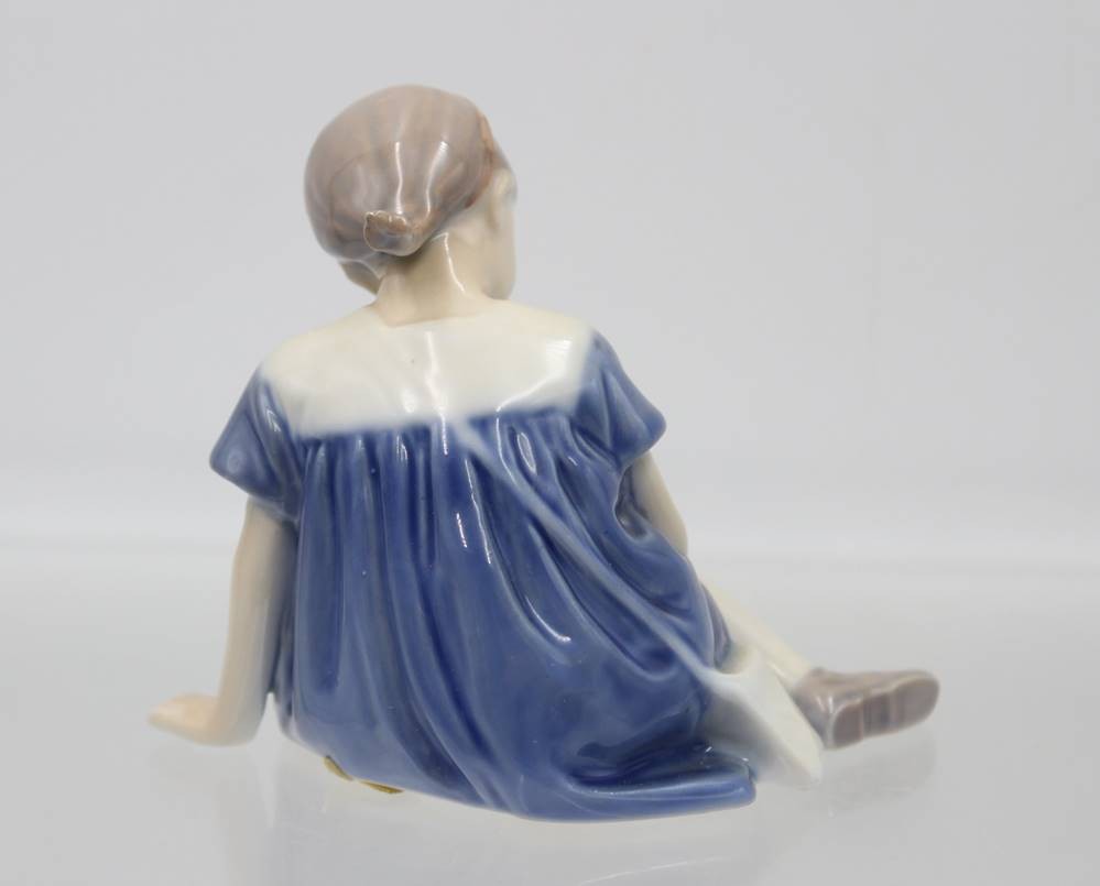 Sitzendes Mädchen mit Puppe, Bing & Gröndahl, Modellnr. 1526, Entw. Ingeborg Plockross-Irminger, polychrome Unterglasurmalerei, H-9cm [1]