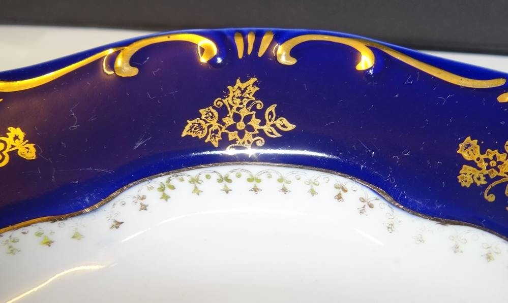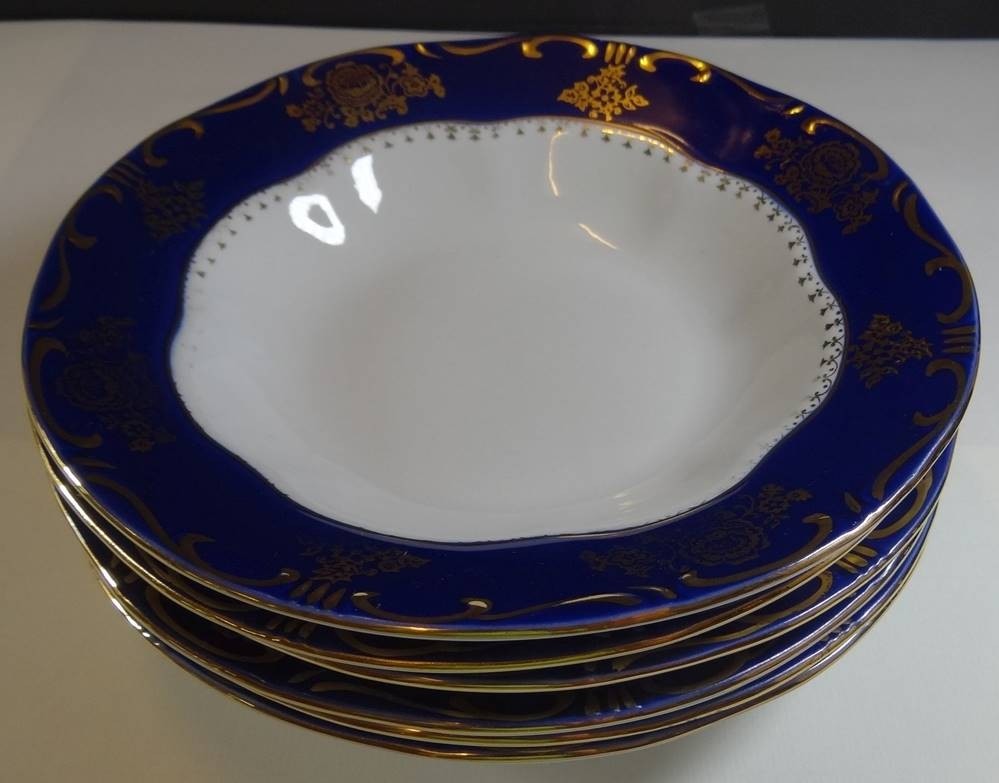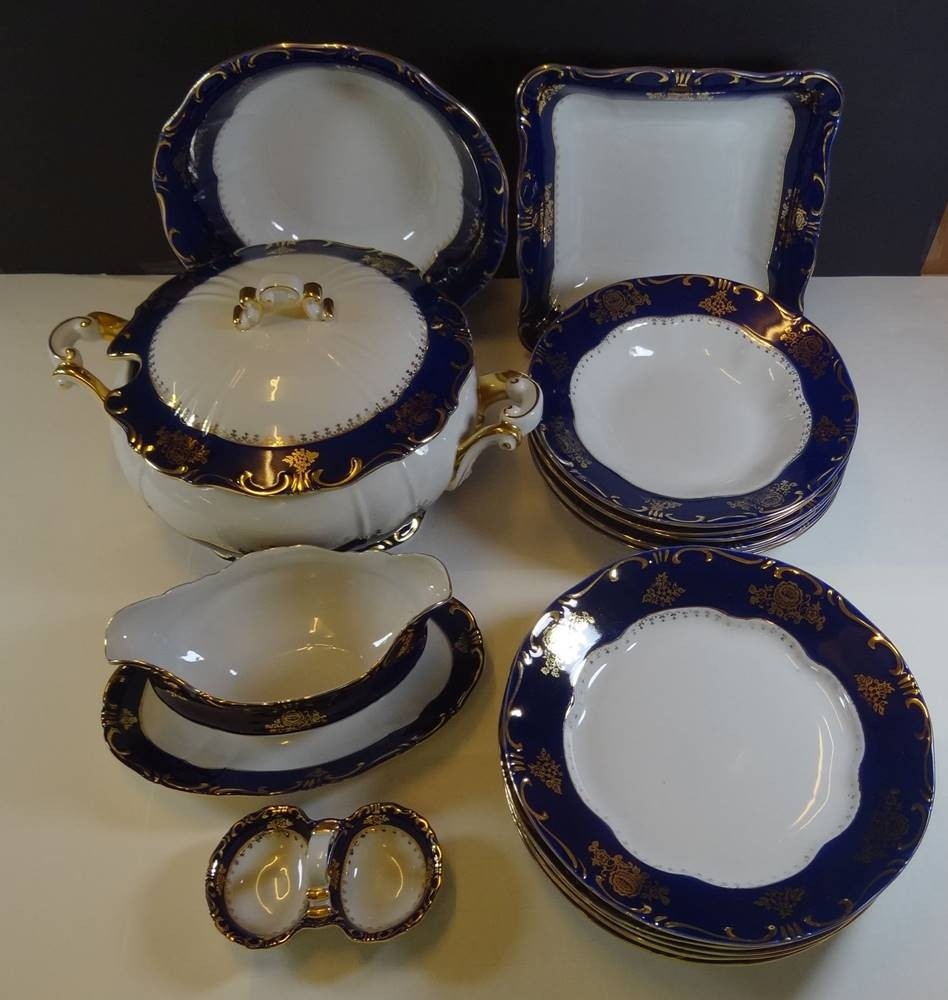 Speiseservice "Zsolnay" Ungarn, kobalt mit Gold, 17 Teile, 6 flache (1x Unterseite mit Chip), 6 tiefe Teller, Suppenterrine, Sauciere, runde und eckige Schale, Gewürzbehälter