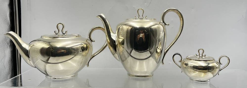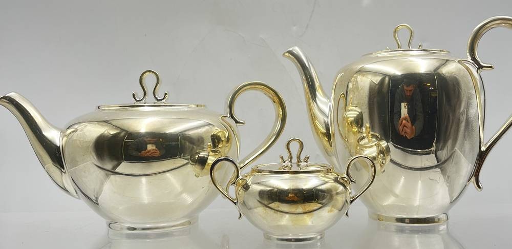 Tee+Kaffeekanne und Sahnekännchen, Feinsilber-Auflage 1000/000, Löwenmarke, sehr guter Zustand, H-max. 18 cm [1]