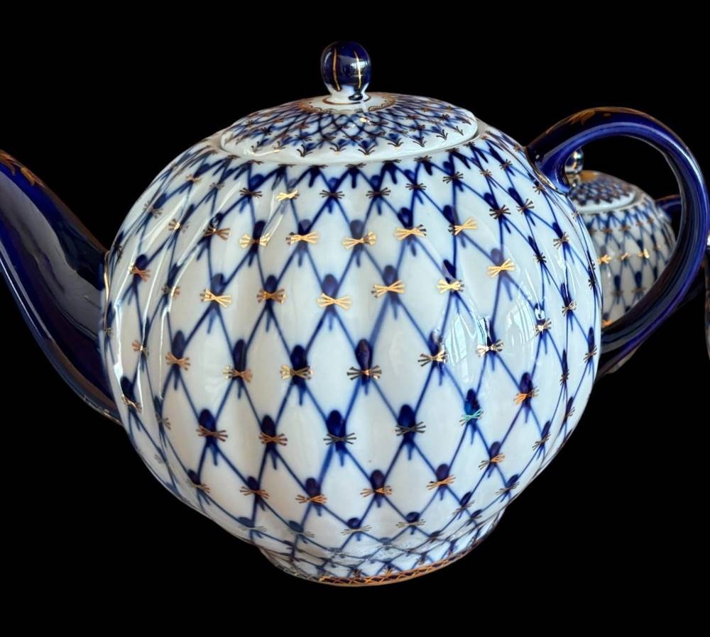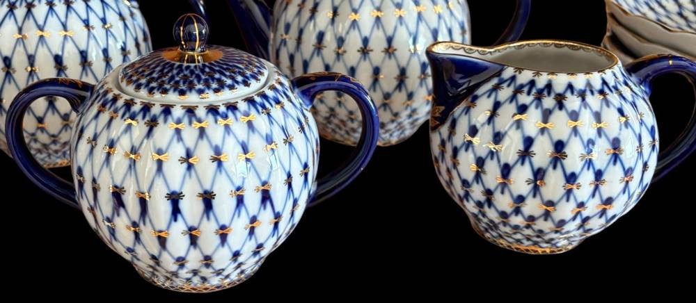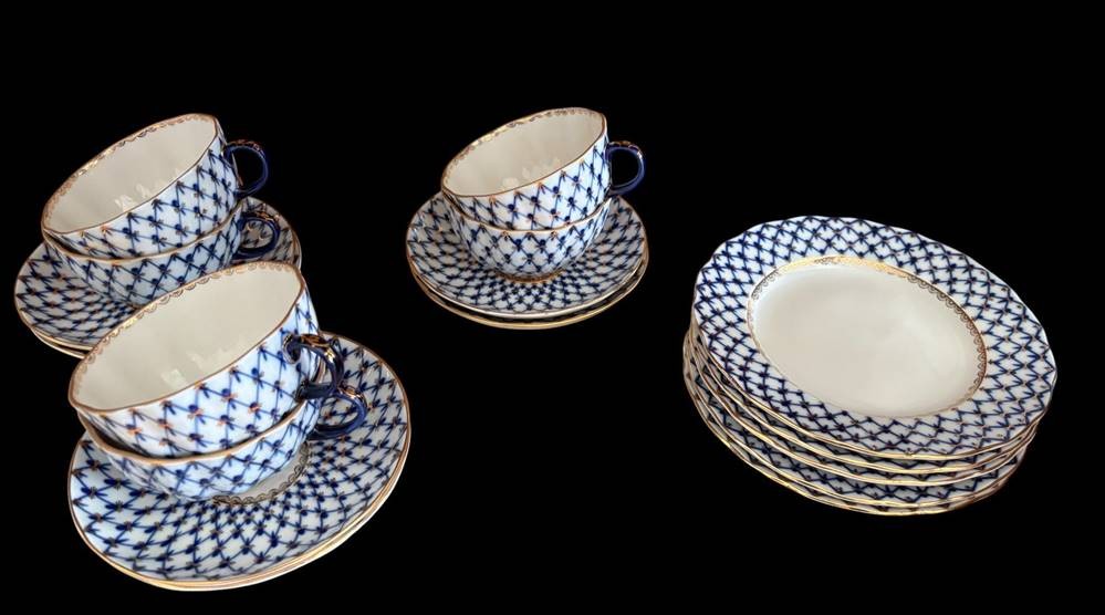 Teeservice für 6 Personen "Lomonossov" Netzdekor mit Goldstaffage, Teekern, 6 Tassen, 6 U.T., 5 Kuchenteller,20 Teile, Kannenhöhe 17 cm [1]
