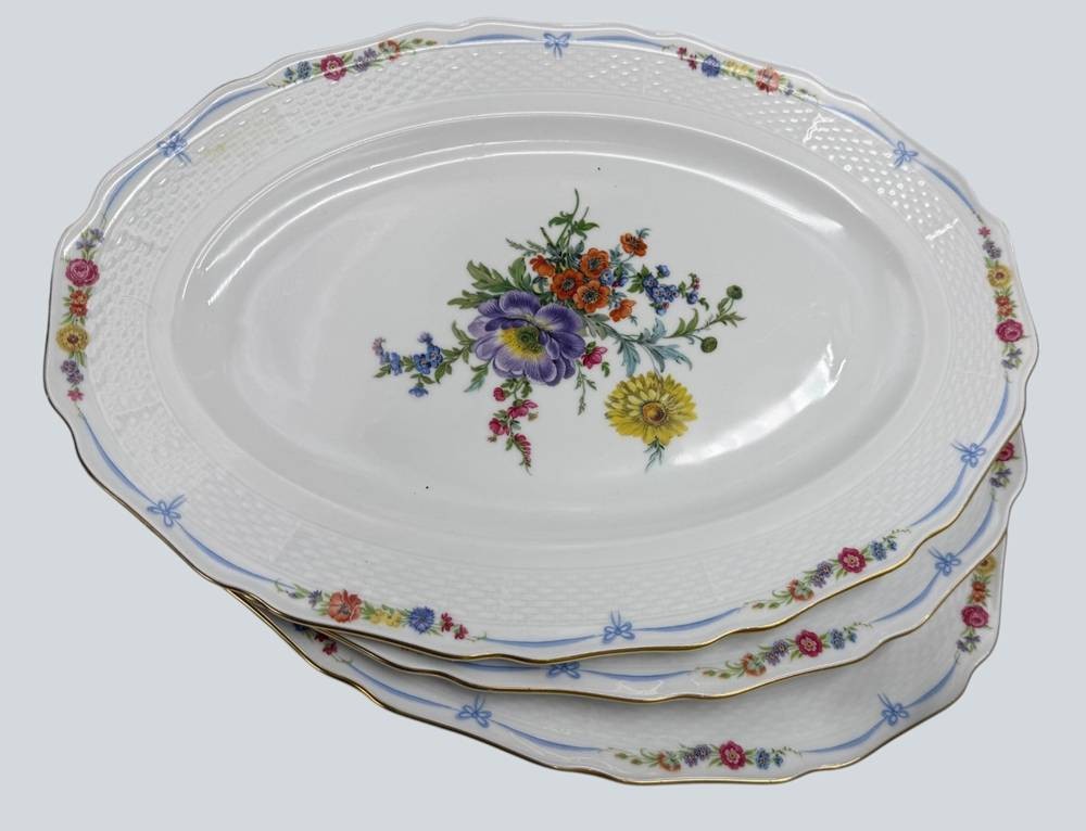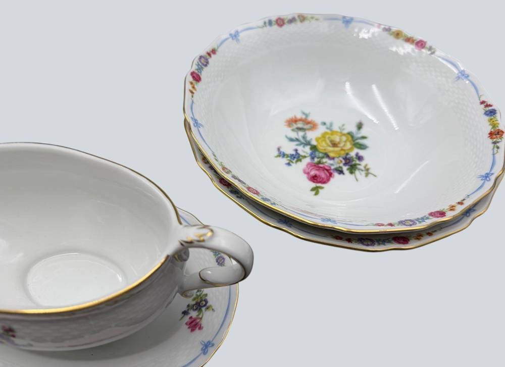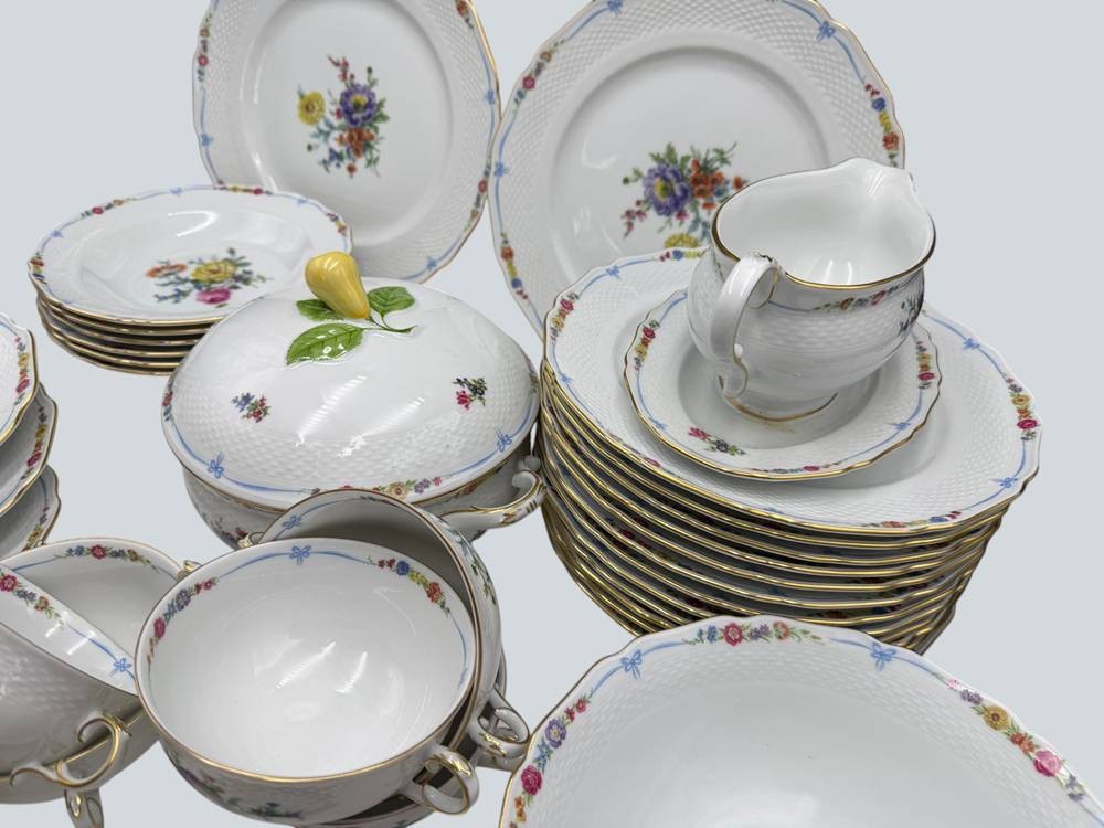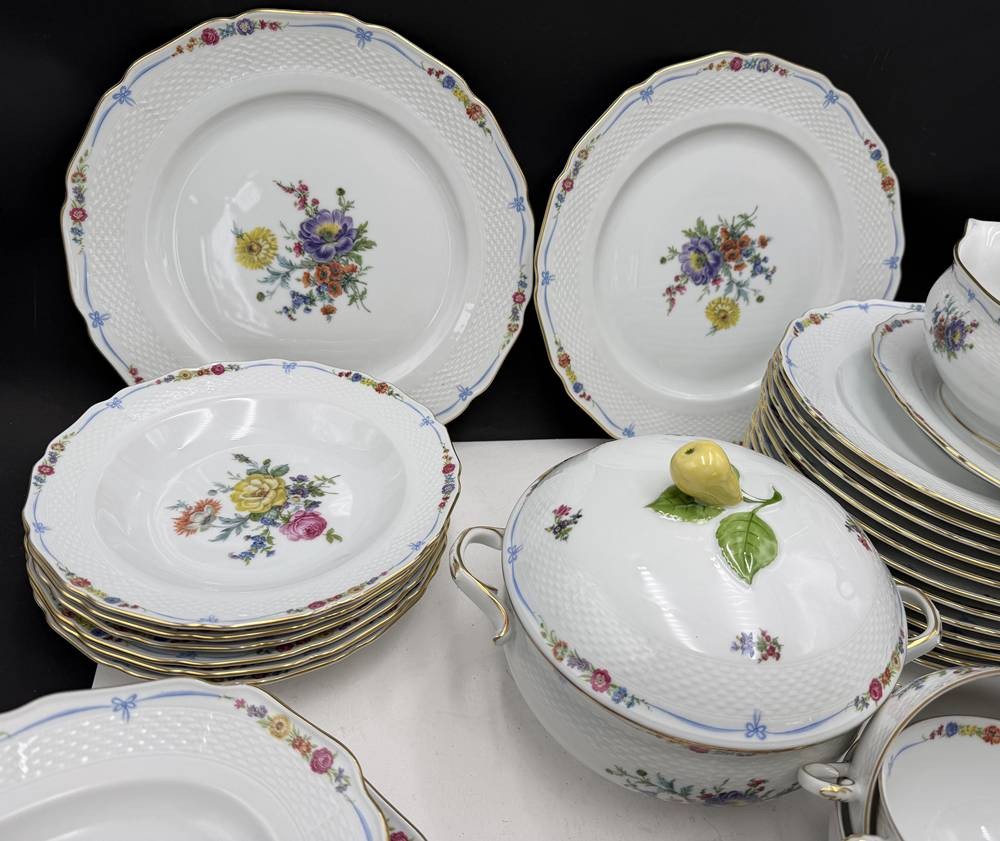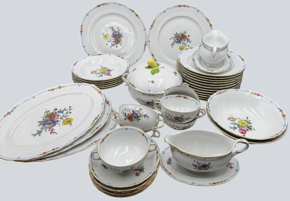 umfangreiches Speiseservice von "Kaiser" Maria Theresia, Terrine, 2 gr. runde Platten, 3 gr. ovale Platten, 2 Schüsseln, 2 Saicieren, 6 Suppentassen mit U.T., 6 tiefe und 12 flache Teller, 40 Teile [1]