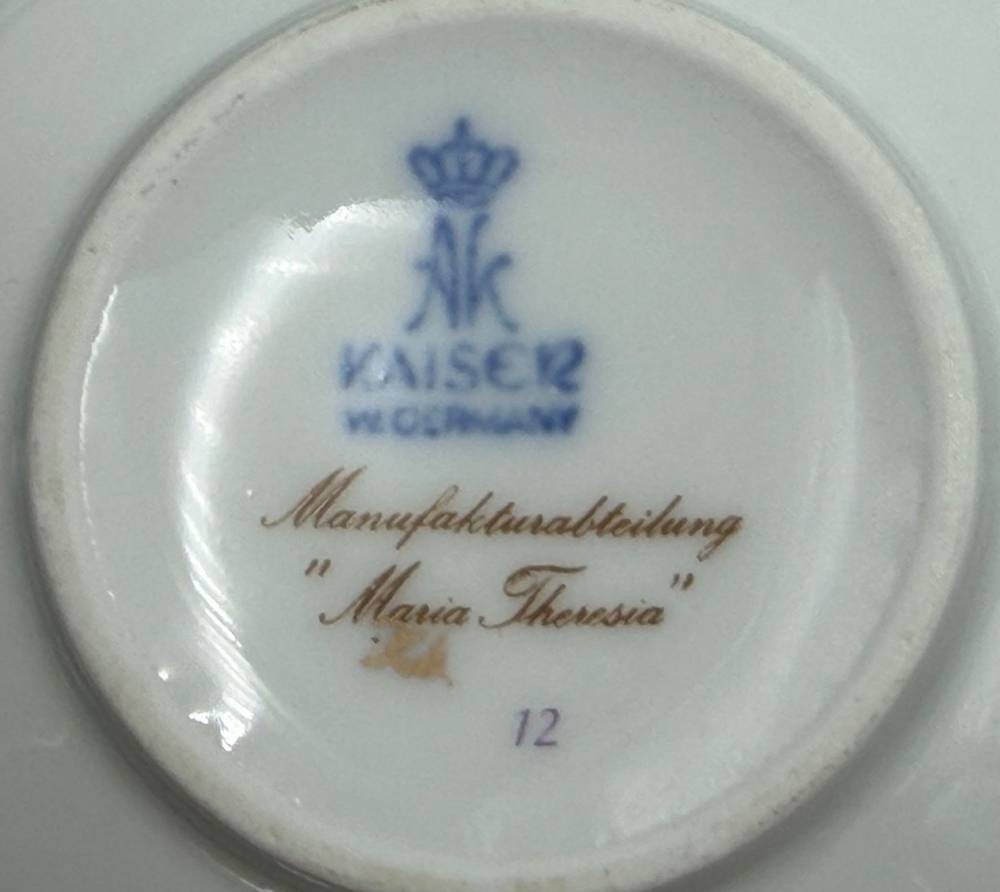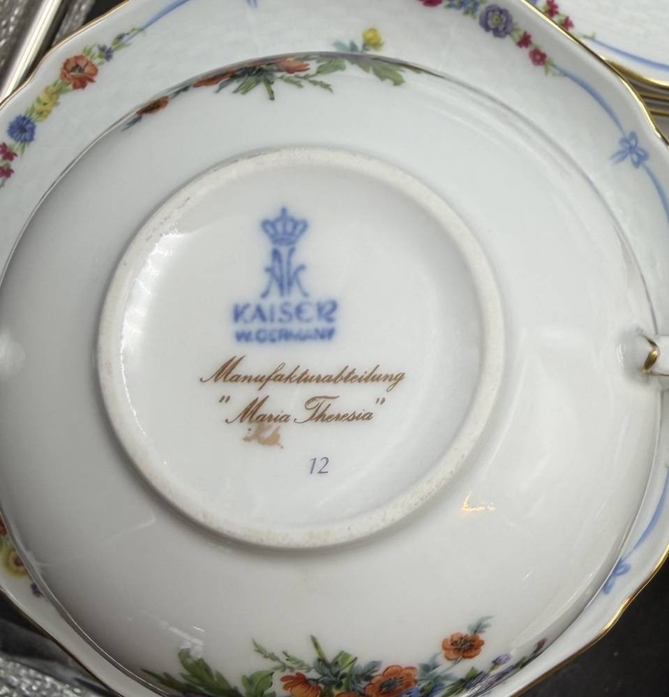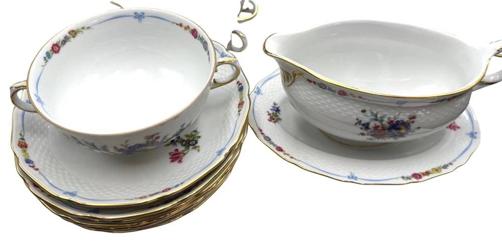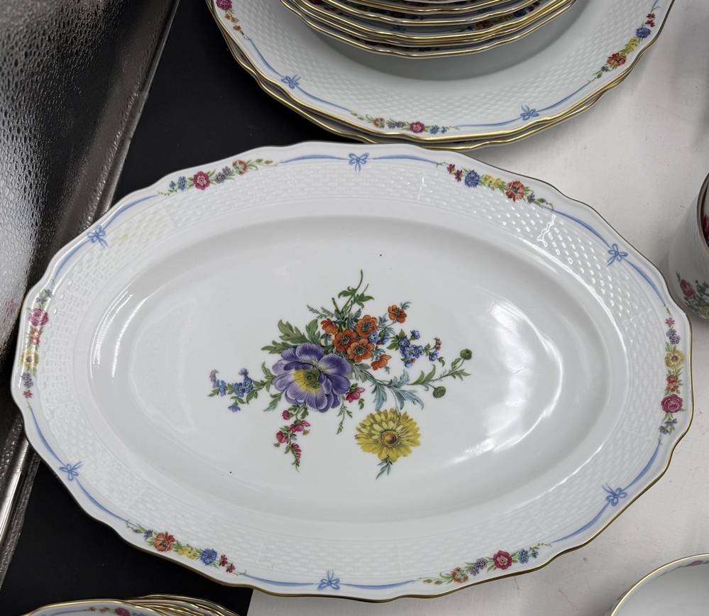umfangreiches Speiseservice von "Kaiser" Maria Theresia, Terrine, 2 gr. runde Platten, 3 gr. ovale Platten, 2 Schüsseln, 2 Saicieren, 6 Suppentassen mit U.T., 6 tiefe und 12 flache Teller, 40 Teile