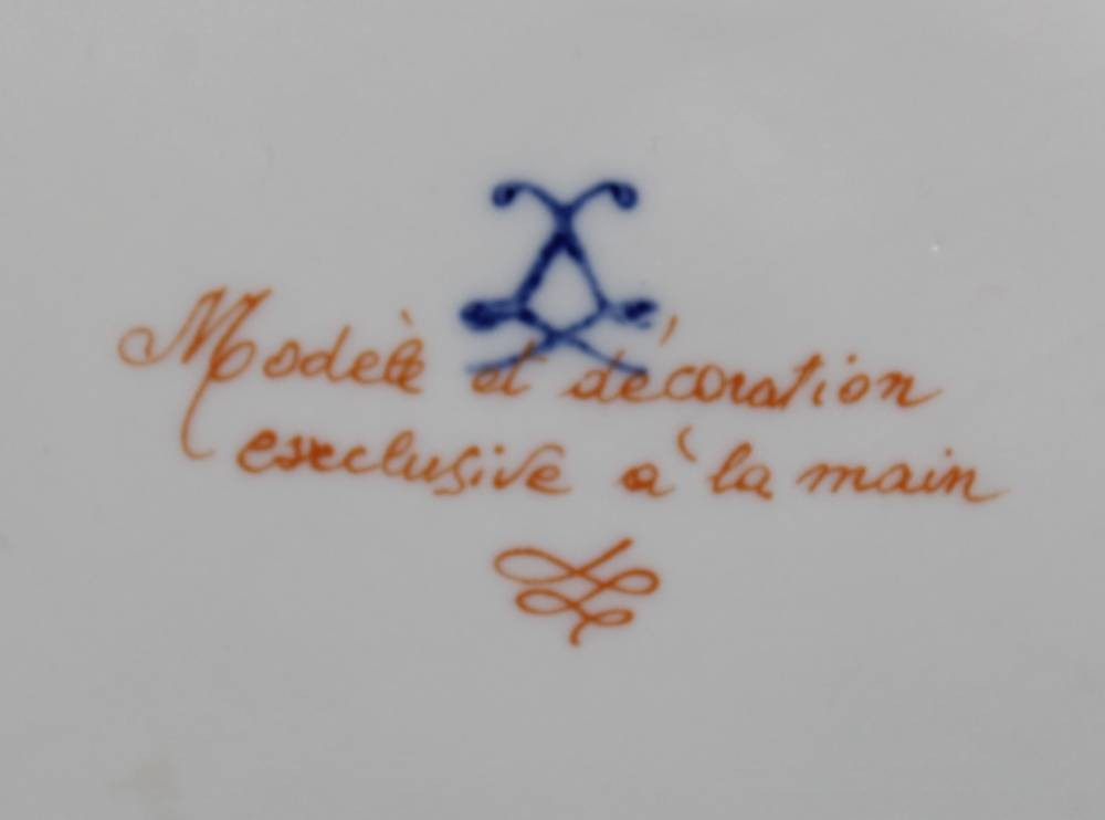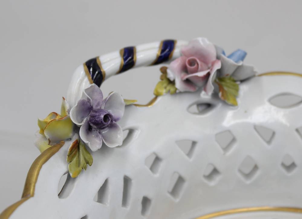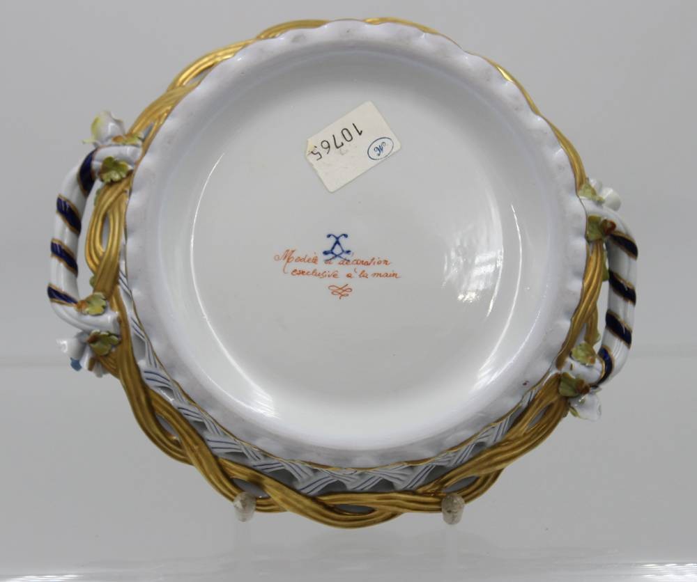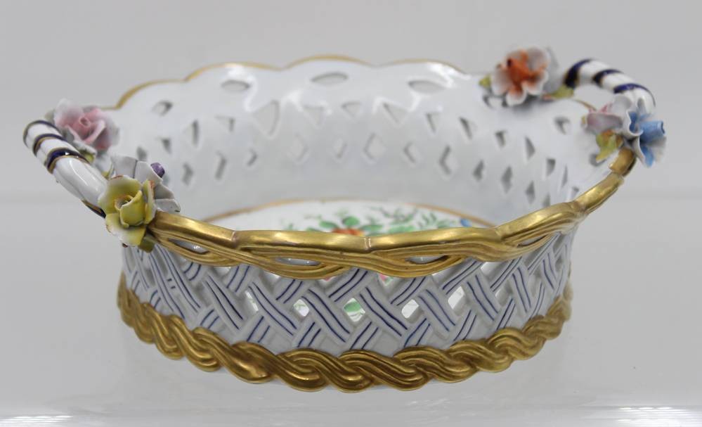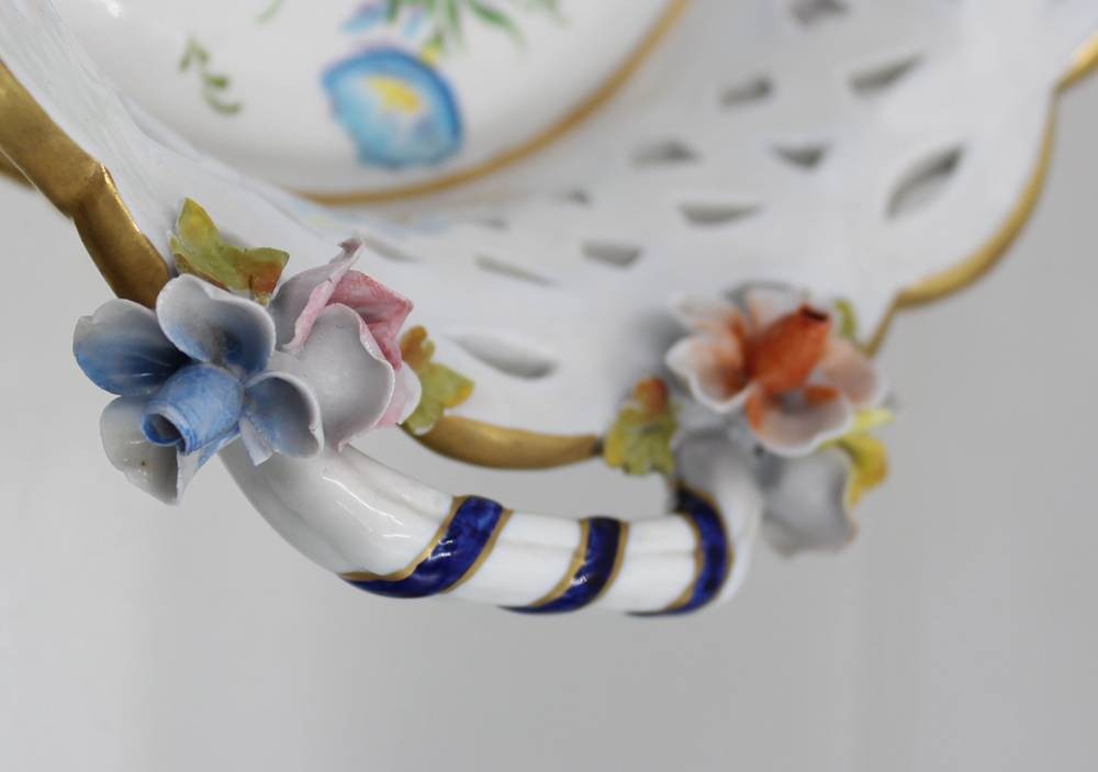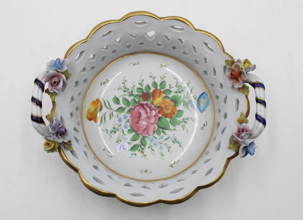 Zierschale mit aufgesetzten Blüten, Frankreich, Blumenbemalung und Goldstaffage, Blüten min. bestossen, ca. H-8cm D-20cm [1]