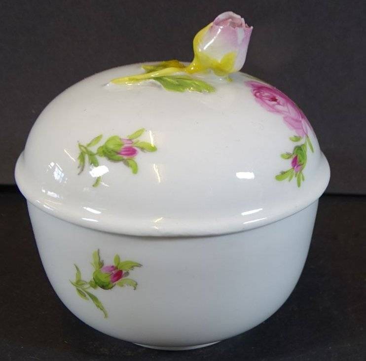 Zuckerdose, Meissen, Rote Rose, 2.Wahl, Deckelrose mit kl. Chip, H-8 cm, D-8 cm [1]