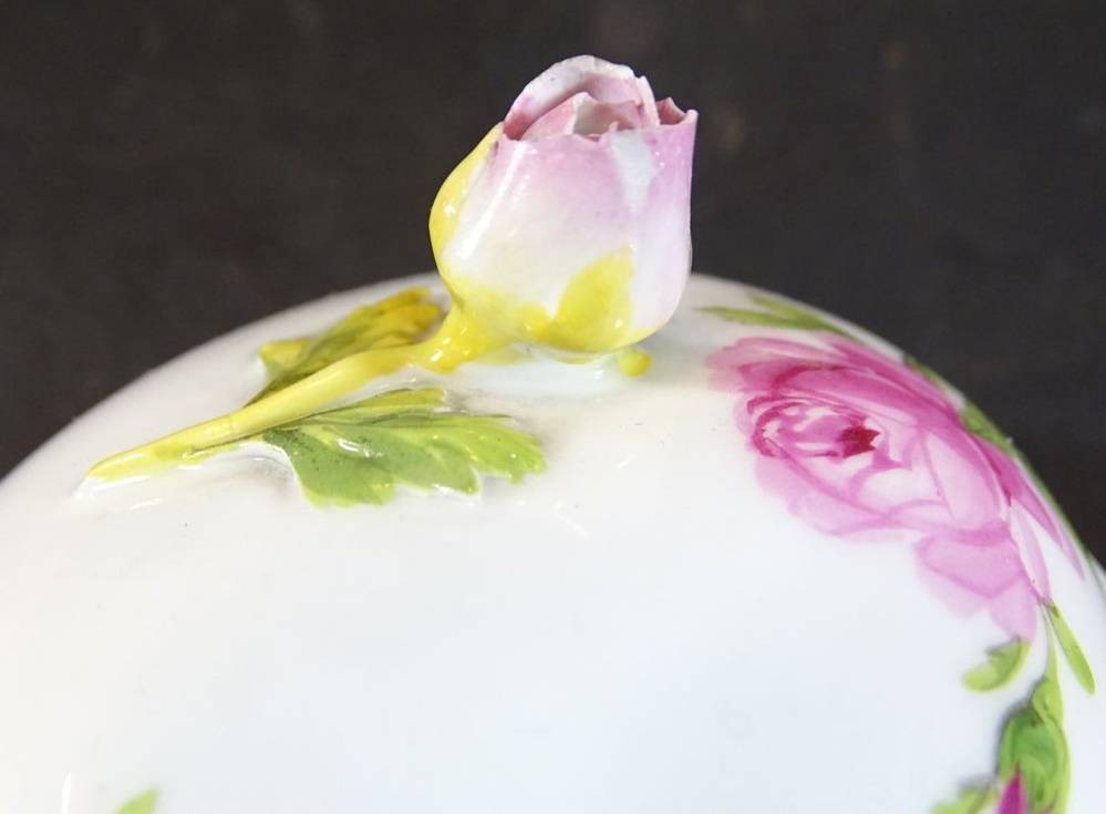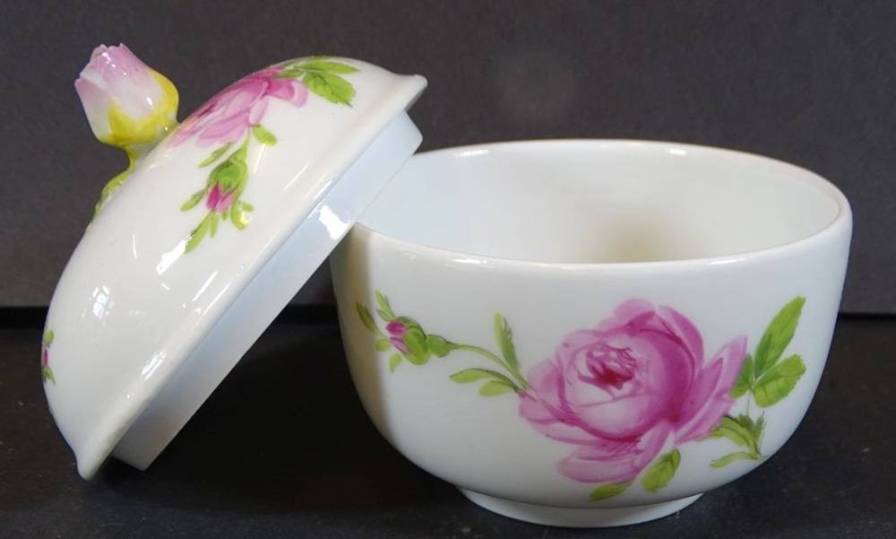 Zuckerdose, Meissen, Rote Rose, 2.Wahl, Deckelrose mit kl. Chip, H-8 cm, D-8 cm