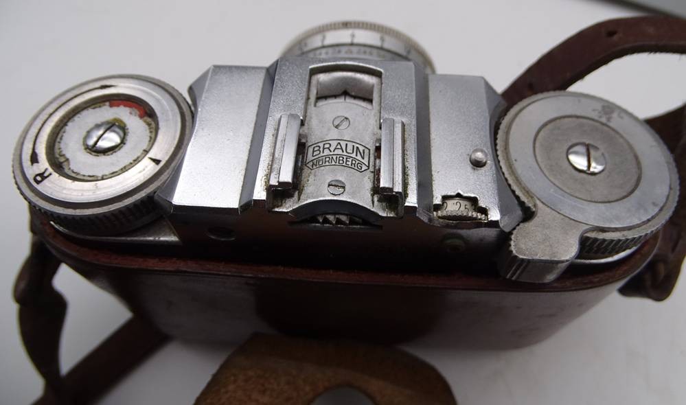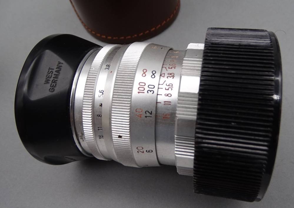 Fototasche mit Kamere Braun Paxette und Blitzlicht Braun F26, Steinhell und Kreuznach-Objektiv Telenar 1:3,8/90 mm, in Tasche