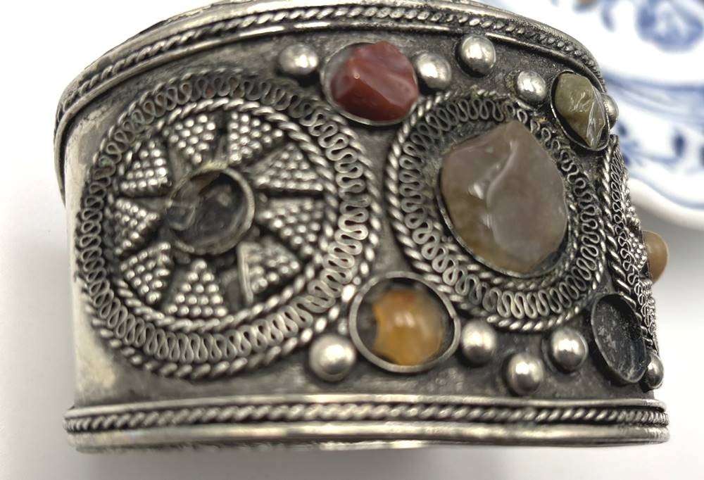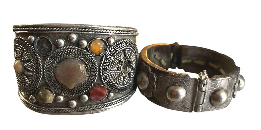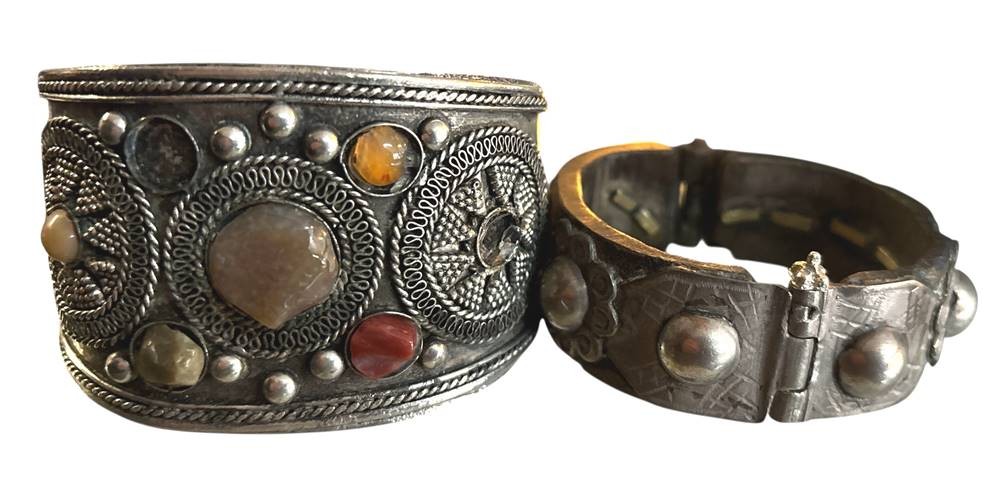 1 Armreif, 1 Armspange, unedles Metall, 1x Leder, 2 Steine fehlen