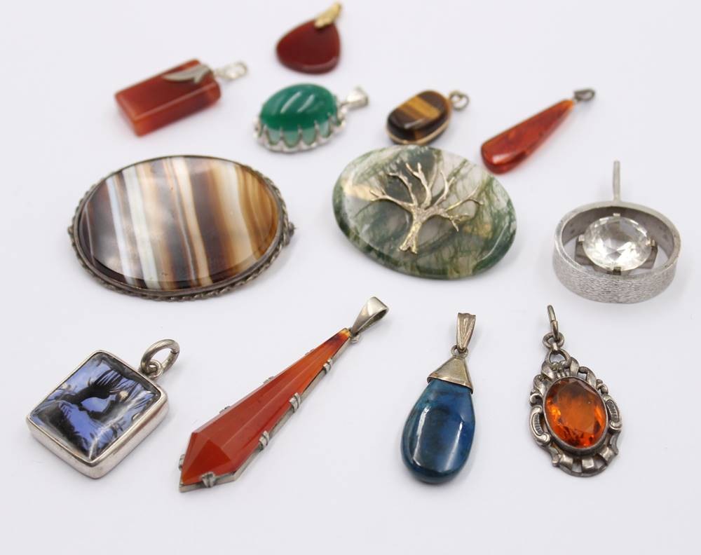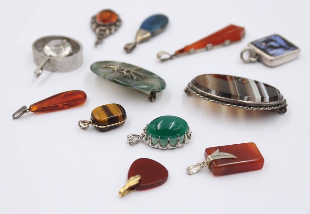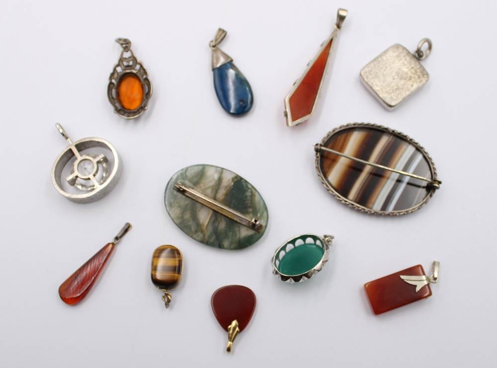 12x div. Anhänger/Broschen, gr. Brosche ca. 3,5 x 4,5cm, teilw. Silber [1]