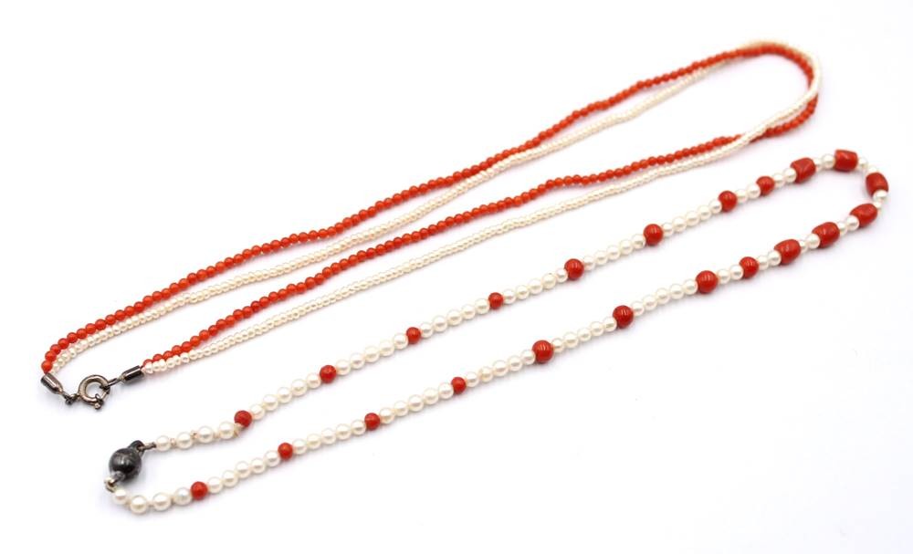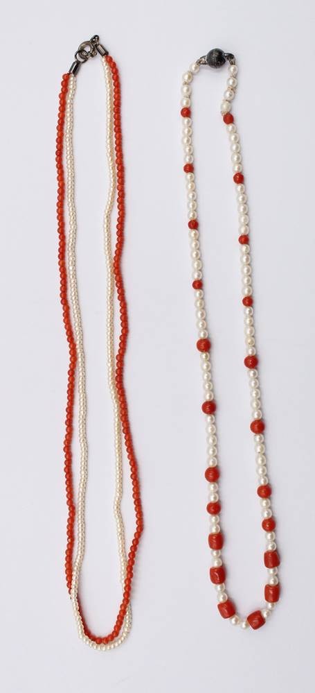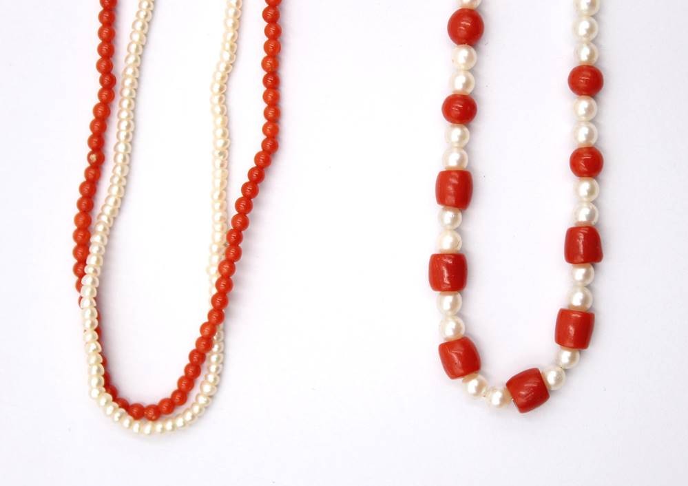 2x div. Halsketten, Perlen & Koralle, 1x 2reihig, ca. L-36cm [1]
