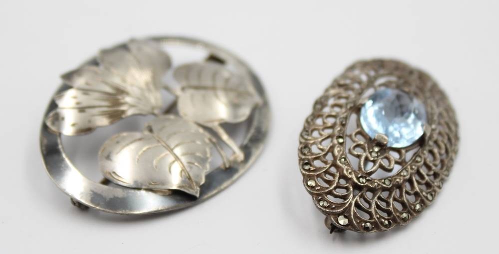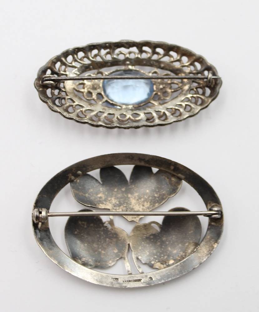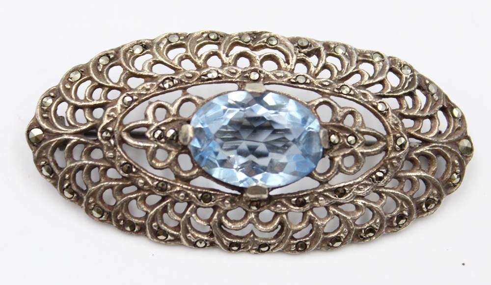 2x div. Silber-Broschen, älter, 1x Markasiten und hellblauer Stein, ca. zus. 13,1gr., L-4,8cm [1]