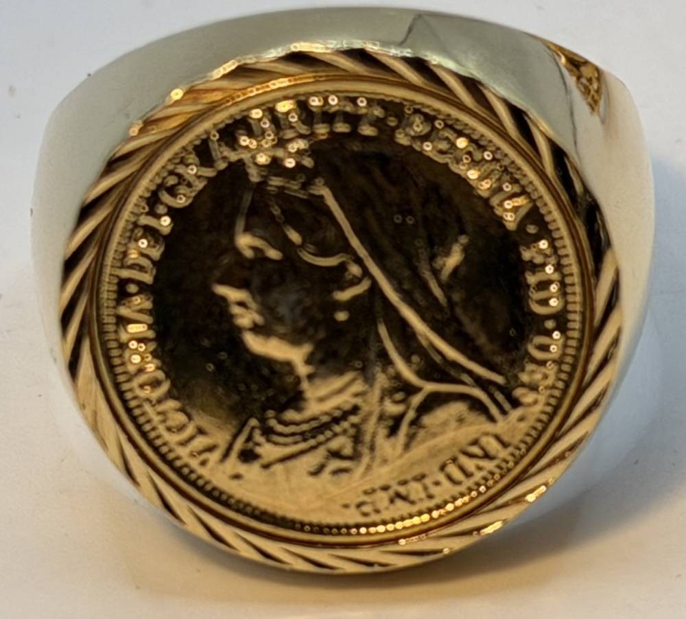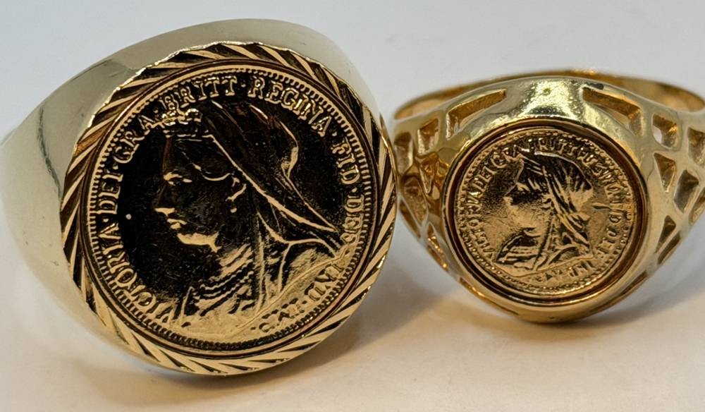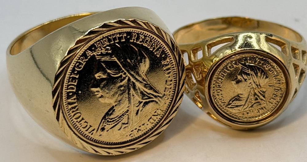 2x goldfarbene Münzringe, 1x massiv , 16,7 und 3,9 gr., 2x Queen Victoria, beide guter Zustand [1]