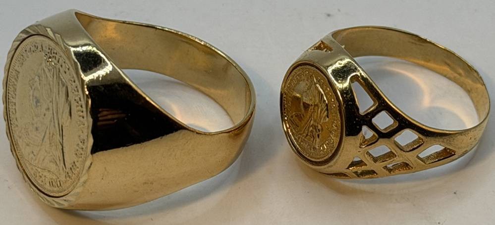 2x goldfarbene Münzringe, 1x massiv , 16,7 und 3,9 gr., 2x Queen Victoria, beide guter Zustand
