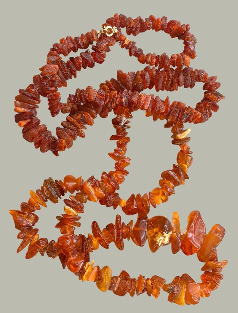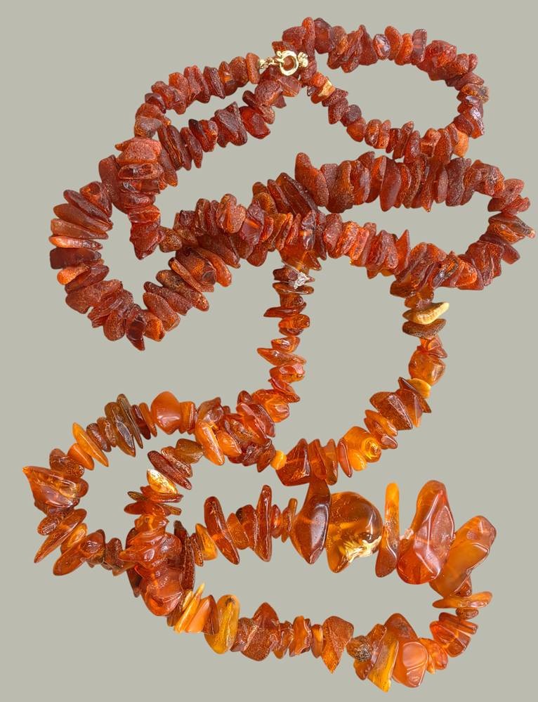 2x schwere, lange Naturbernstein-Halsketten, zusammen ca. 220 gr [1]